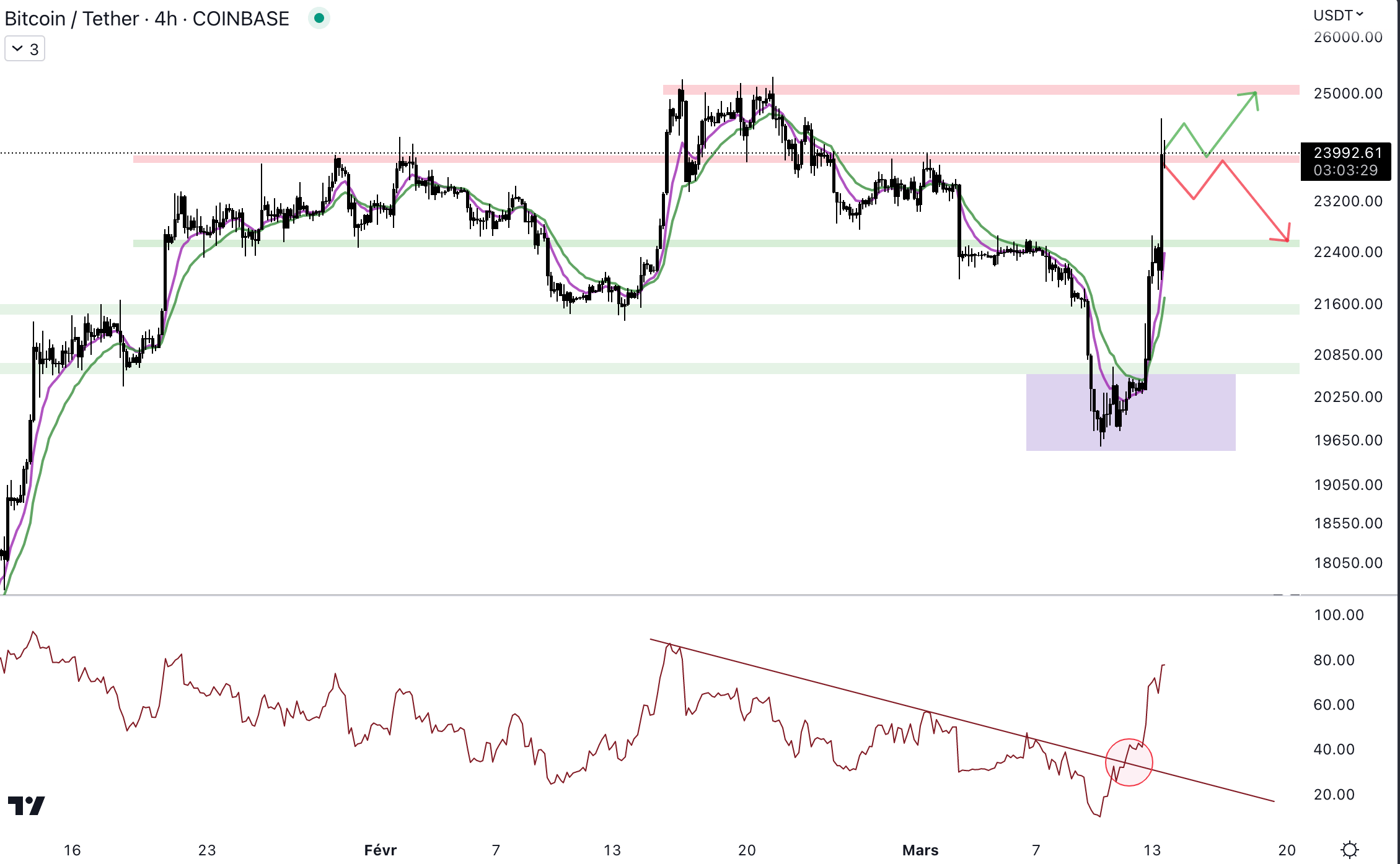 Le mouvement du Bitcoin est impressionnant. On le voit, le BTC a cassé les différentes résistances en 4 h. Les résistances à 20 700 $, à 21 500 $, et à 22 500 $ n’ont pas tenu face à la pression acheteuse.