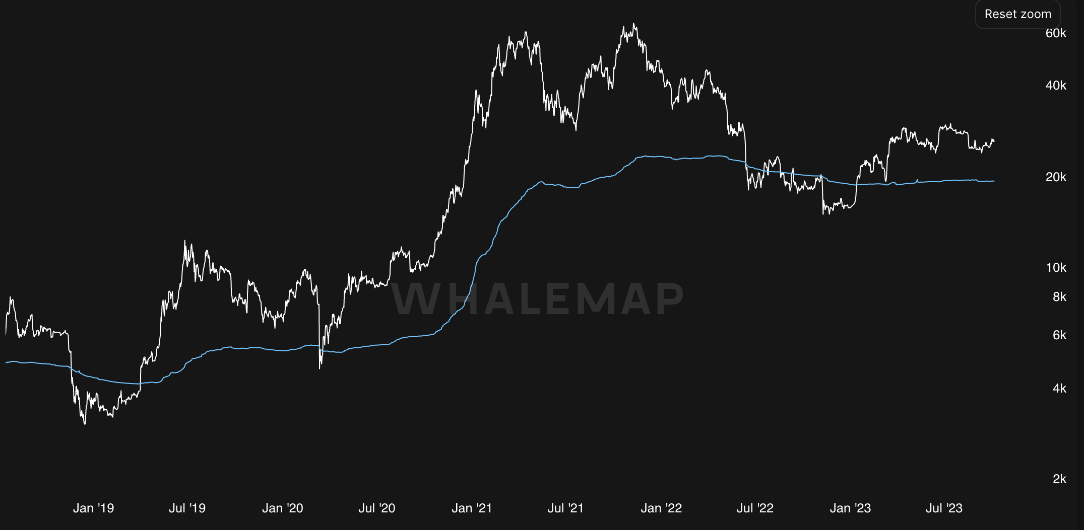 Le graphique ci-dessus représente le prix réalisé (courbe bleue) du Bitcoin. Il s’agit tout simplement du prix d’achat moyen des différents portefeuilles. Or, le prix réalisé se trouve autour des 20 000 $. Avant le bull run de 2021, le cours était revenu deux fois au niveau de la courbe bleue. Si les vendeurs continuent de faire pression sur les acheteurs, et que la résistance à 30 000 $ ne cède pas, le cours pourrait revenir à 20 000 $. Un scénario qui ne ferait pas plaisir aux opérateurs du marché, mais il pourrait s’agir d’un niveau d’achat intéressant si on se réfère au passé. Bien entendu, le Bitcoin est capable de nous surprendre !