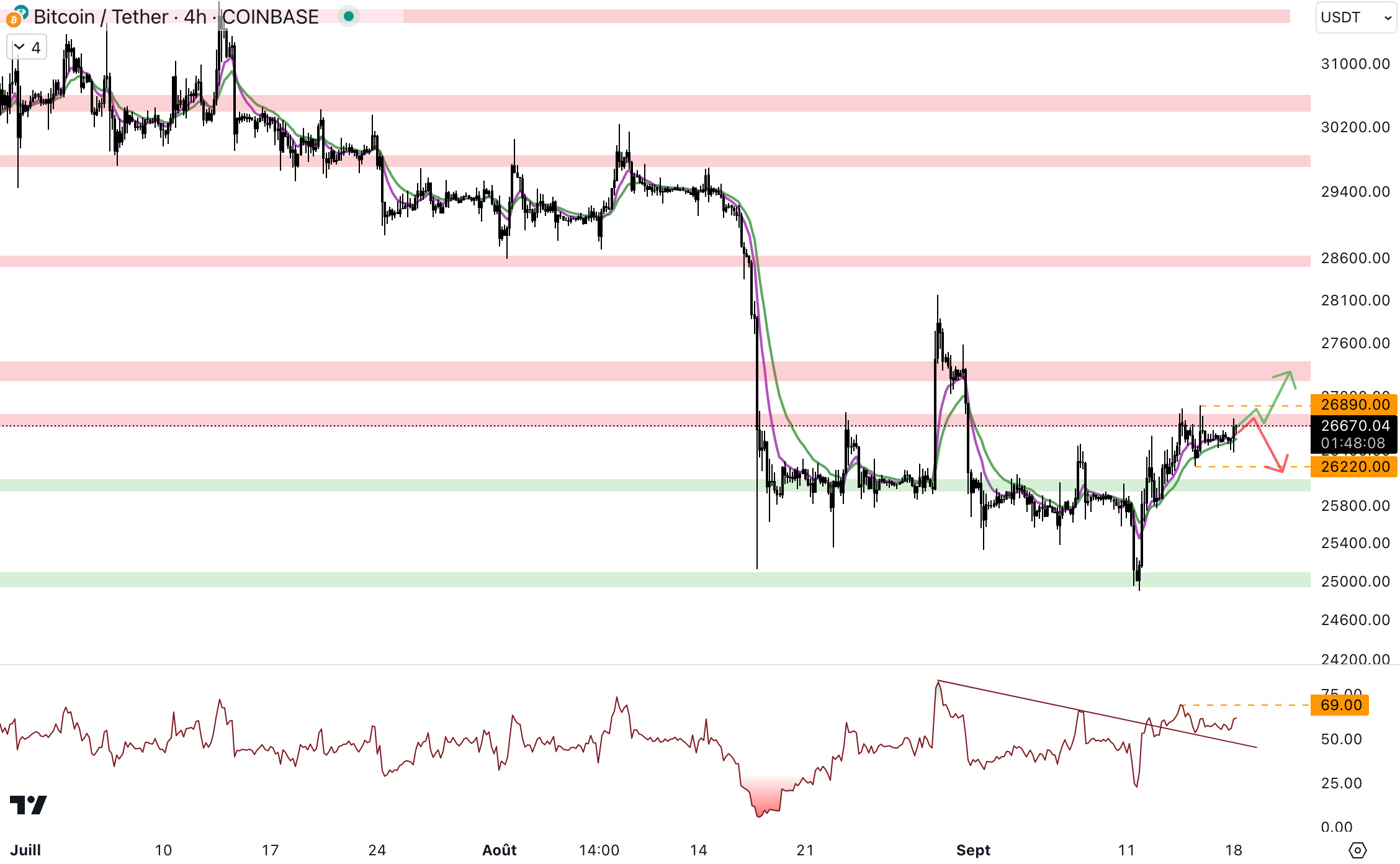 Pour le moment, le cours continue de bloquer au niveau de la résistance à 26 700 $. Le cours ne chute pas en dessous des moyennes mobiles 9 et 18, mais il va falloir reprendre la résistance en tant que support pour éviter une nouvelle baisse :