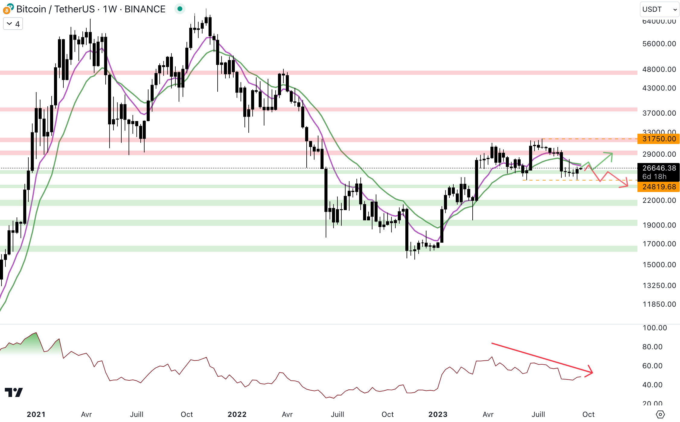 Le BTC a clôturé la semaine au-dessus de 26 500 $. Pour le moment, les acheteurs défendent le niveau de support présent autour de 26 000 $ :