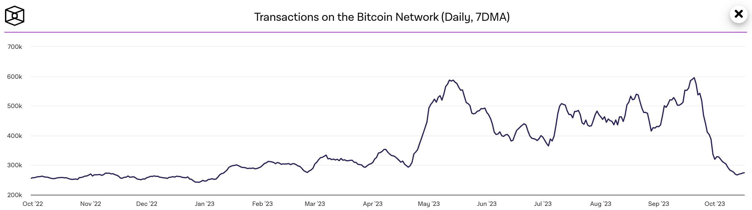 Comme on peut le voir sur le graphique, le nombre de transactions a marqué une tendance haussière à partir du mois de janvier jusqu’au mois de mai. En parallèle, le cours du BTC est passé de 16 500 $ à 31 000 $. Ensuite, le nombre de transactions a latéralisé entre le mois de mai et le mois de septembre. Le cours du BTC, lui, n’a pas vraiment montré de direction claire pendant cette période.