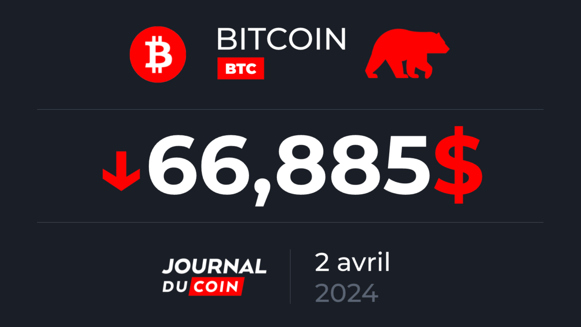 Les vendeurs se montrent en ce début de semaine et début de mois. De fait, le cours du Bitcoin a chuté autour des 66 000 $ et enregistre une baisse de plus de 3 % en 24 heures :