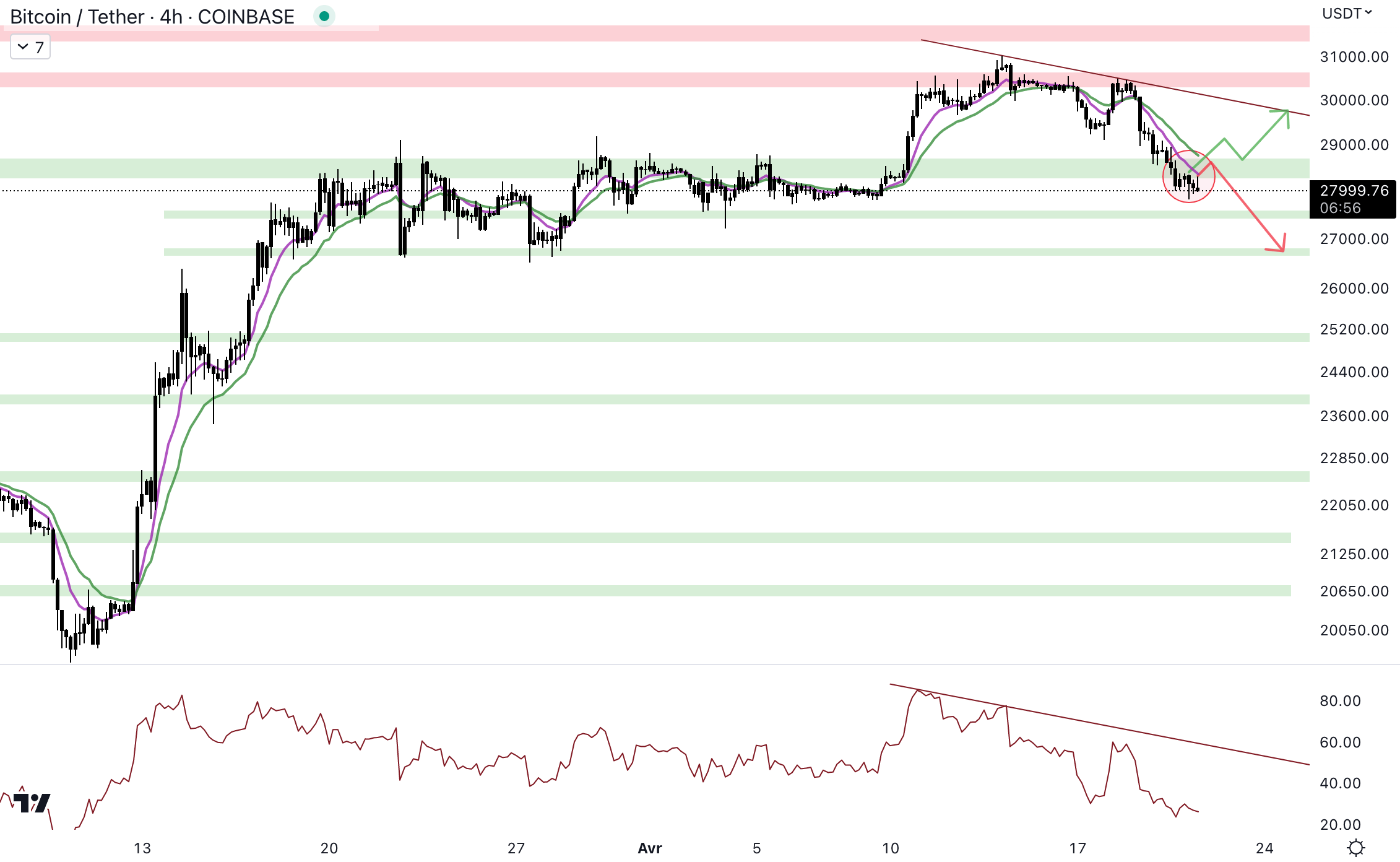 Les acheteurs sont absents pour le moment. Le niveau à 28 500 dollars ne permet pas de soutenir le cours.