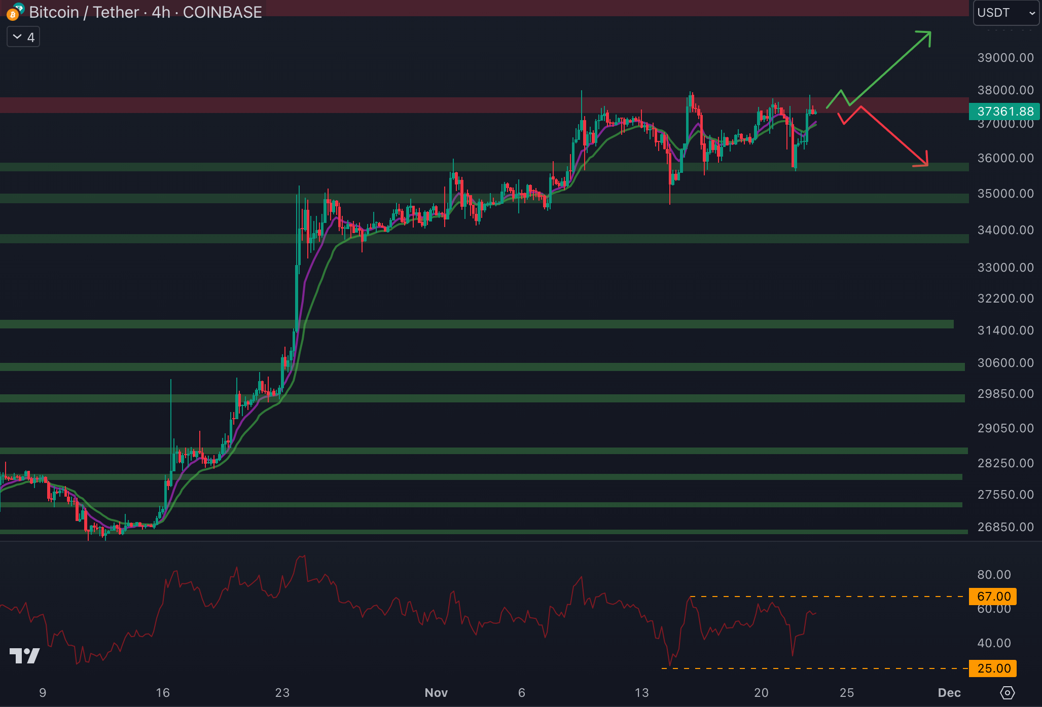Depuis plusieurs semaines, le cours évolue entre les 37 500 $ et les 35 800 $. Le cours oscille entre ces deux bornes, et il tente à nouveau de casser la résistance :