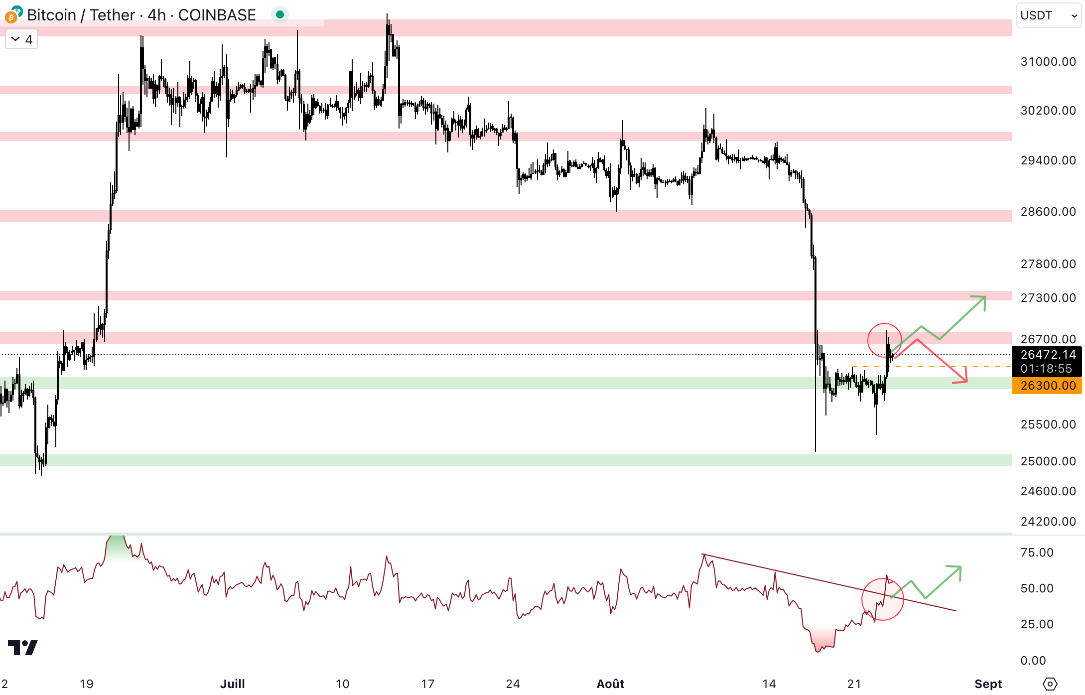 Grâce à ce rebond, et à la clôture au-delà de 26 300 dollars, le cours du Bitcoin retrouve une dynamique haussière avec des creux et des sommets ascendants à très court terme. Si les acheteurs poussent, le cours pourrait casser la résistance et revenir au niveau de la prochaine résistance située à 27 300 dollars. En revanche, en cas de rejet, le cours pourrait revenir au niveau du support à 26 000 dollars. Le RSI casse la trendline baissière, il faudrait continuer à se développer au-dessus de cette trendline. Ainsi, les acheteurs pourraient retrouver le momentum à court terme.