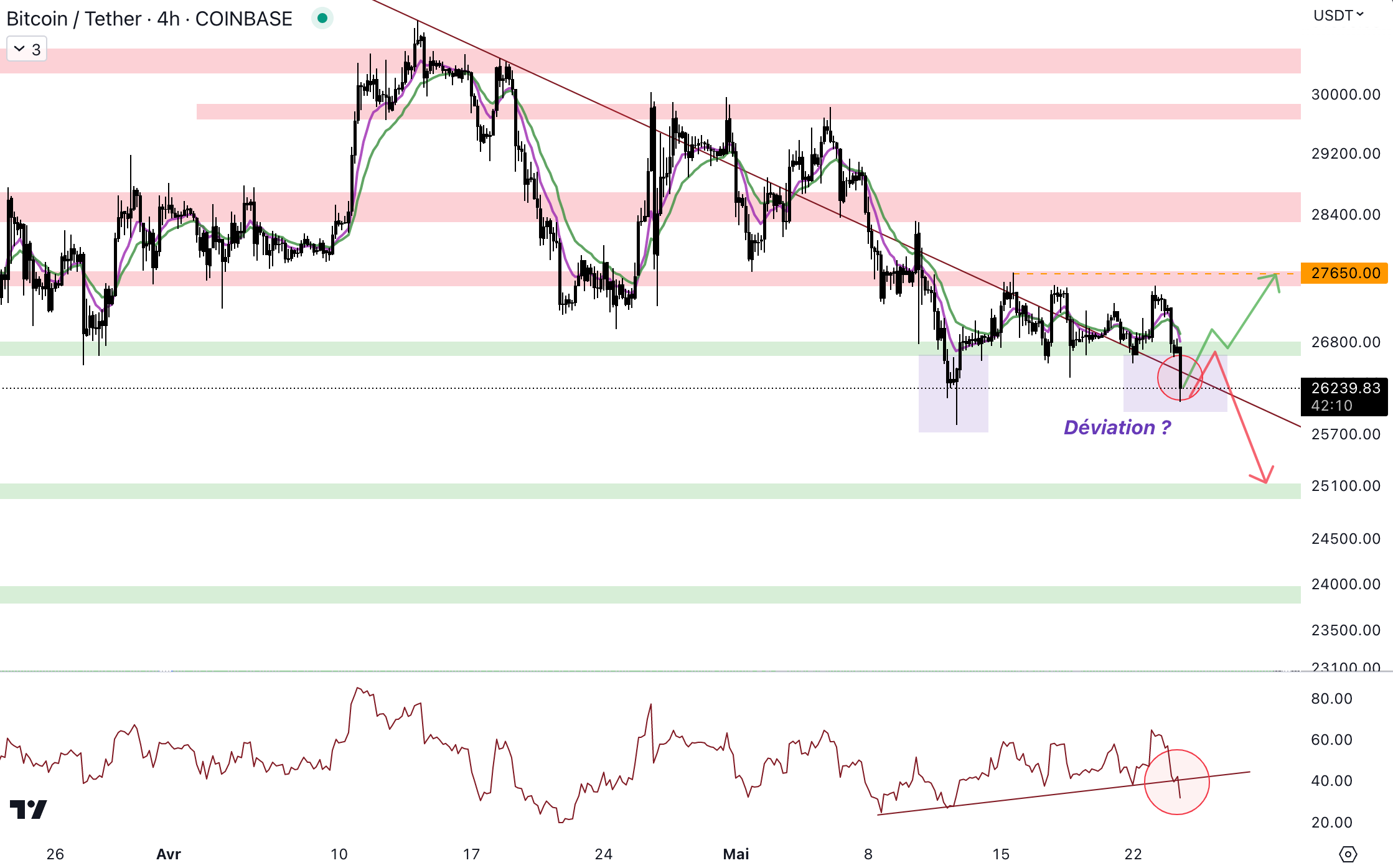 Le 12 mai, le cours avait marqué une première déviation en dessous du support à 26 700 $. Le cours est de nouveau en train de chuter sous le support à 26 700 $ :