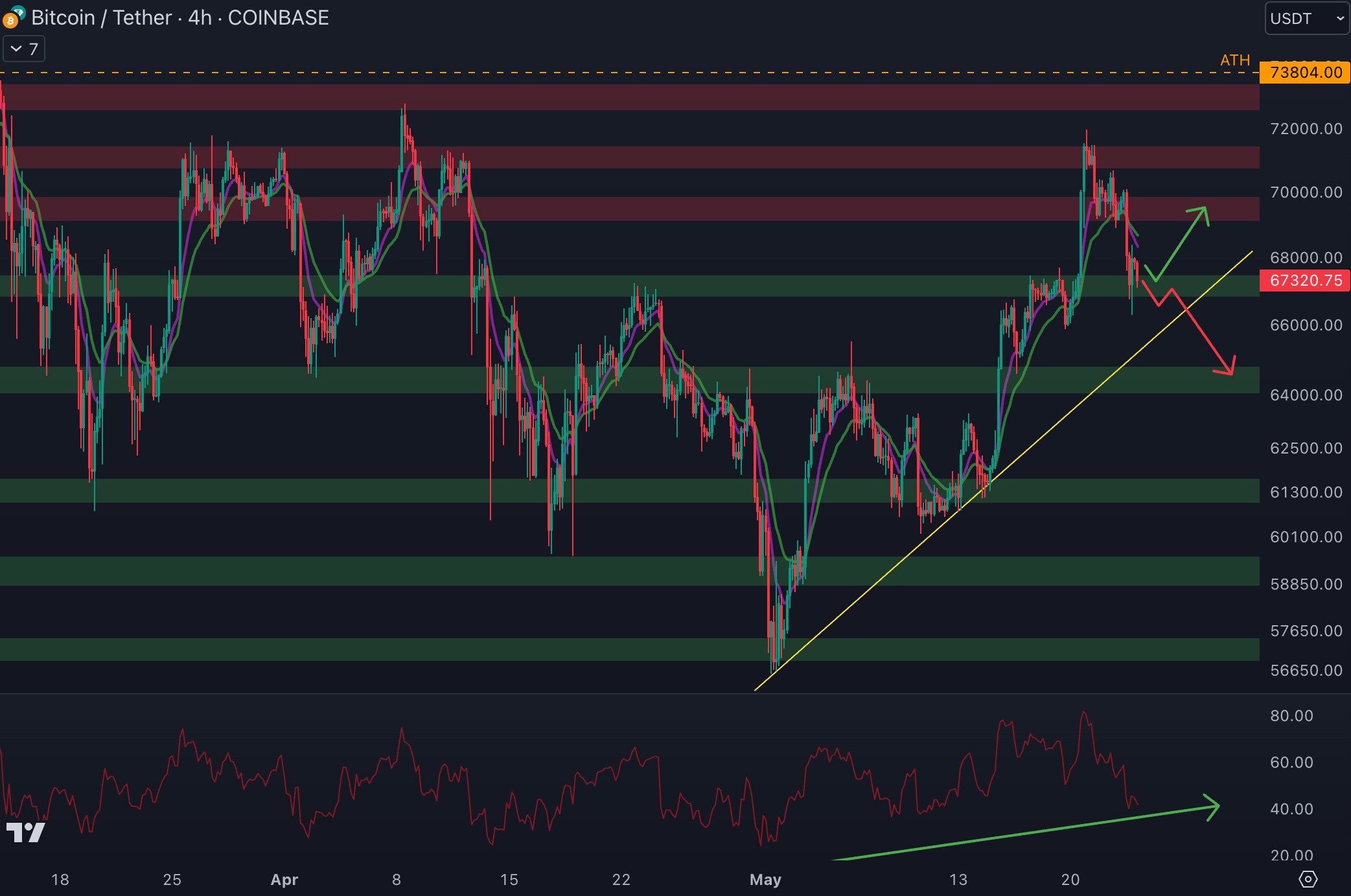 Ici, les acheteurs ont la possibilité de reprendre la main et de ramener le BTC au niveau de la résistance à 69 500 $. En revanche, si le biais institutionnel (EMA 9/EMA 18) baissier fait barrage, et que les 67 000 $ cassent, un retour à 64 500 $ est possible. Pour le moment, le cours évolue au-delà de la trendline haussière, les acheteurs ont la main sur le cours. De son côté, le RSI affiche une dynamique haussière, les acheteurs ont l‘avantage du momentum.