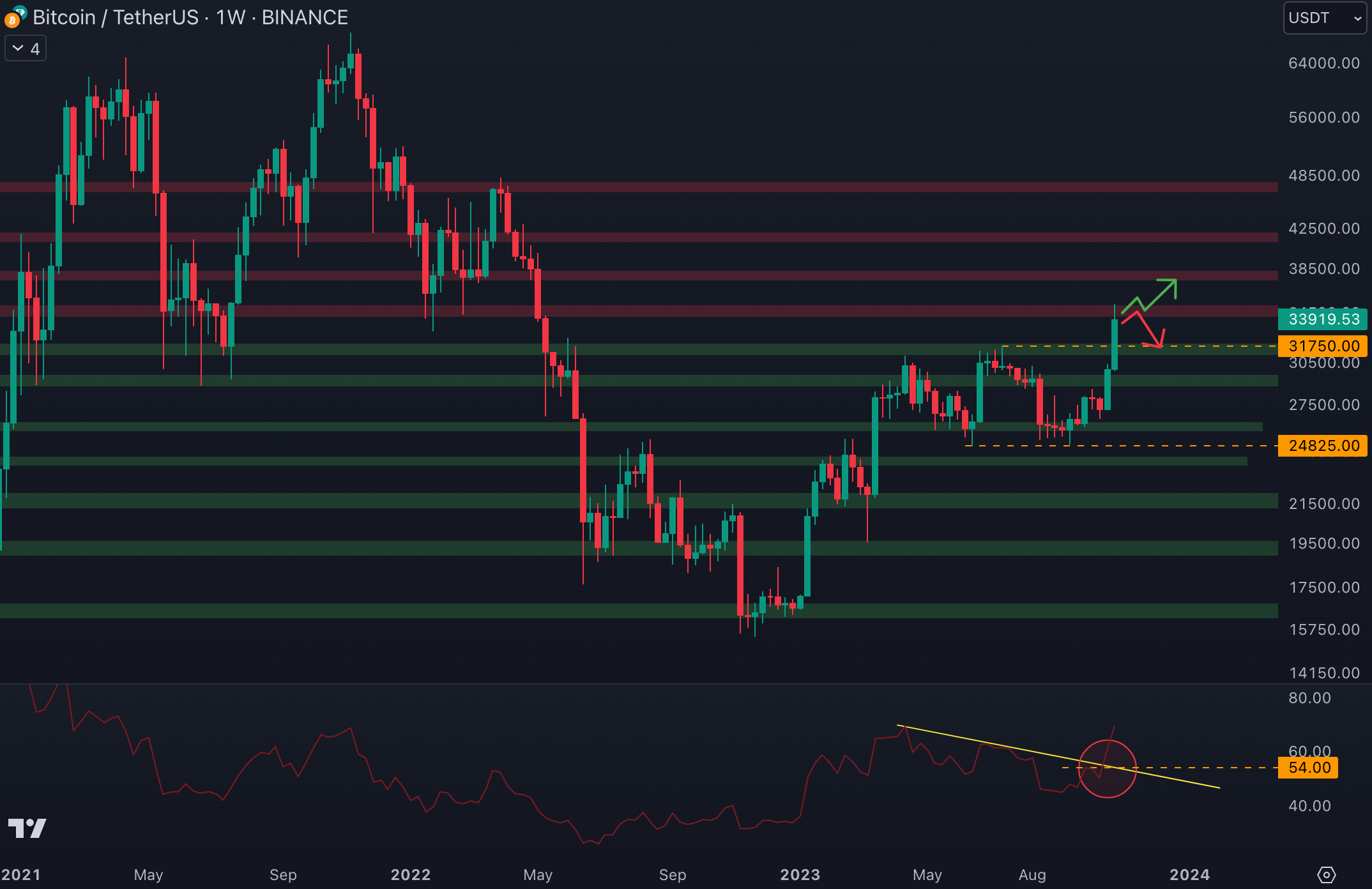 Lorsque le cours explose à la hausse de la sorte, il est intéressant de prendre un peu de recul par rapport à la situation. Le cours du Bitcoin doit clôturer la semaine au-dessus de la zone de résistance hebdomadaire autour des 30 000 $. Avec la cassure de cette zone de résistance, le cours sortirait du range entre le support à 26 000 $, et la résistance à 31 000 $ :