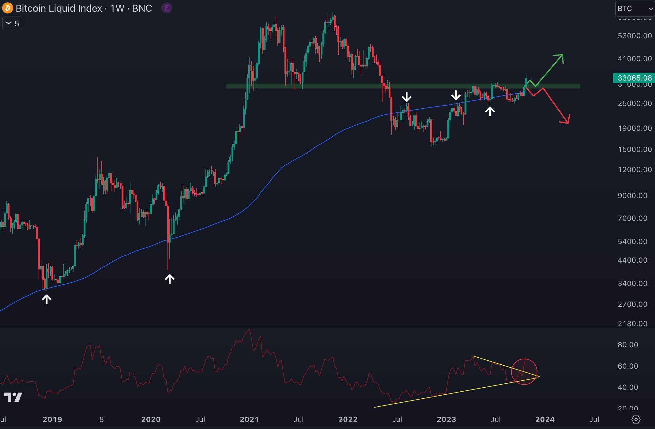 En 2023, le cours a oscillé autour de la MA200, le niveau ayant servi de support et de résistance. La clôture hebdomadaire de la semaine dernière s’est faite au-dessus de la MA 200, et cela a provoqué une importante volatilité haussière sur le cours du BTC.