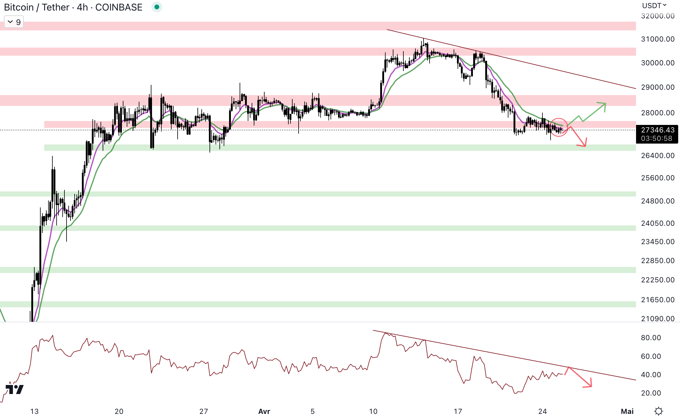 Le cours bloque au niveau du biais institutionnel (EMA 9/EMA 18) baissier. Les vendeurs ont la possibilité d’entamer une nouvelle vague de baisse pour rejoindre le support autour de 26 700 $. En revanche, si les bulls se réveillent et récupèrent la zone à 27 500 $, le cours pourrait rejoindre la prochaine résistance à 28 500 $. Le RSI est proche de la trendline baissière, il pourrait se faire rejeter dans les jours à venir.