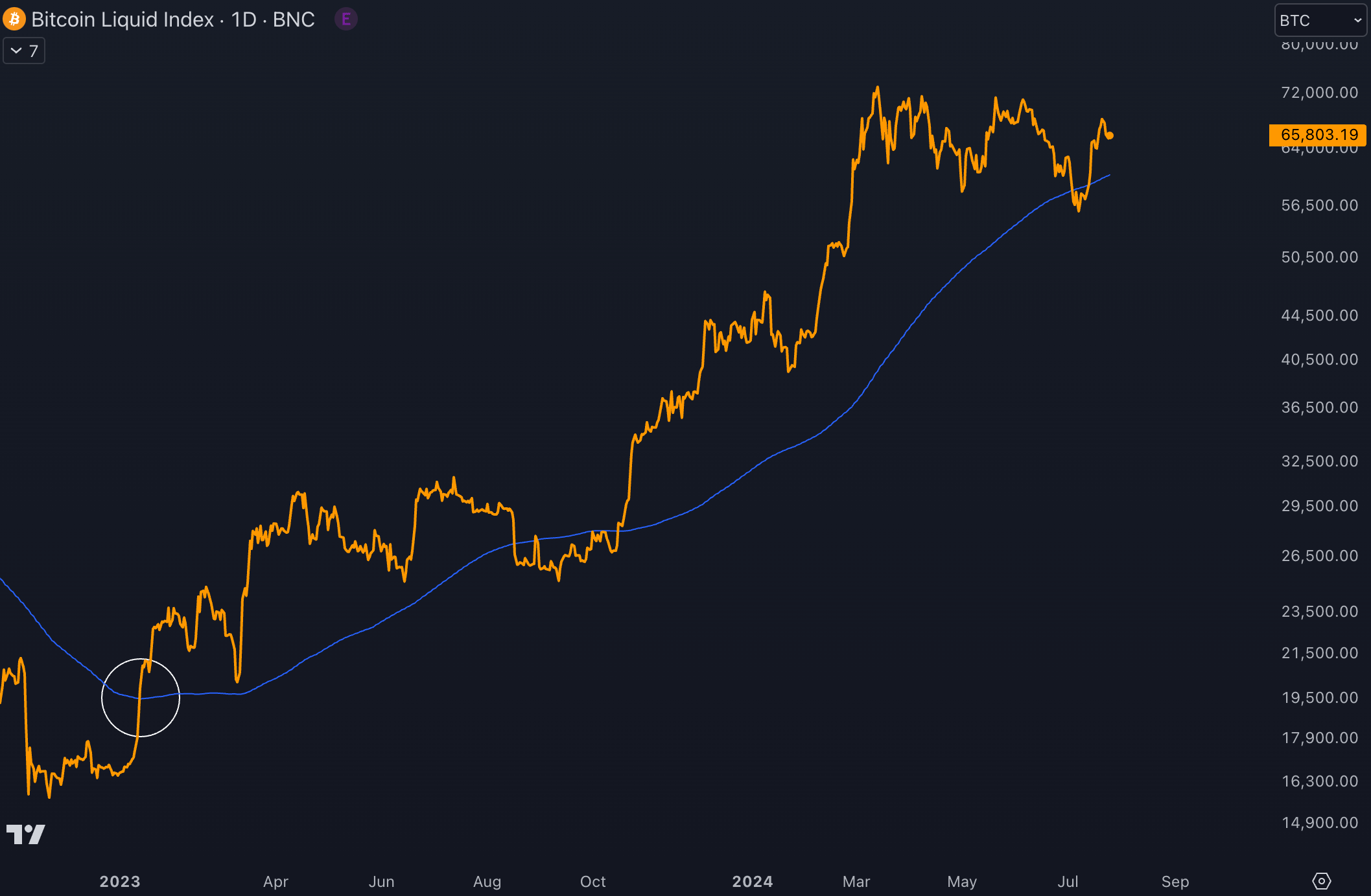 Or, lorsque le BTC évolue sous la moyenne mobile à 200 jours (courbe bleue), il est considéré comme fragile, et potentiellement baissier. À l’inverse, si le cours est au-delà de la moyenne mobile à 200 jours, le BTC est considéré comme haussier. Et la récente chute en dessous des 60 000 $ a fait paniquer les opérateurs, car le BTC a brièvement chuté sous la courbe bleue :