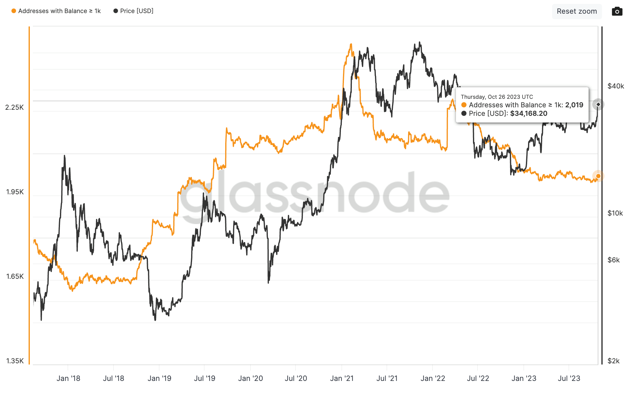 Le BTC surprend les opérateurs avec une hausse d’environ 100 % en 2023. Le roi des cryptomonnaies surperforme largement le S&P 500, l’or ou bien d’autres cryptomonnaies comme Ethereum. Cependant, la récente hausse qui a ramené le cours à 35 000 $ s’est faite sans les baleines :