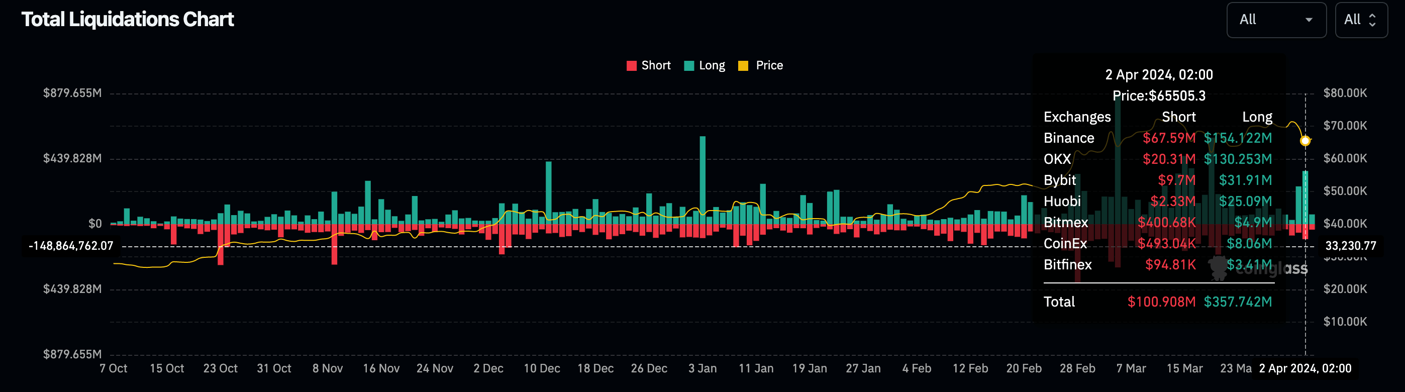 Lorsque de la volatilité est présente sur le marché des cryptomonnaies – et surtout sur le BTC – de nombreux opérateurs se cassent les dents. C’est au tour des acteurs qui parient à la hausse (long) de connaître d’importantes liquidations. La chute en dessous des 70 000 $ connue le 1ᵉʳ avril a engendré plus de 300 millions de dollars de liquidations. La chute d’hier en dessous des 65 000 $ a également fait des dégâts :