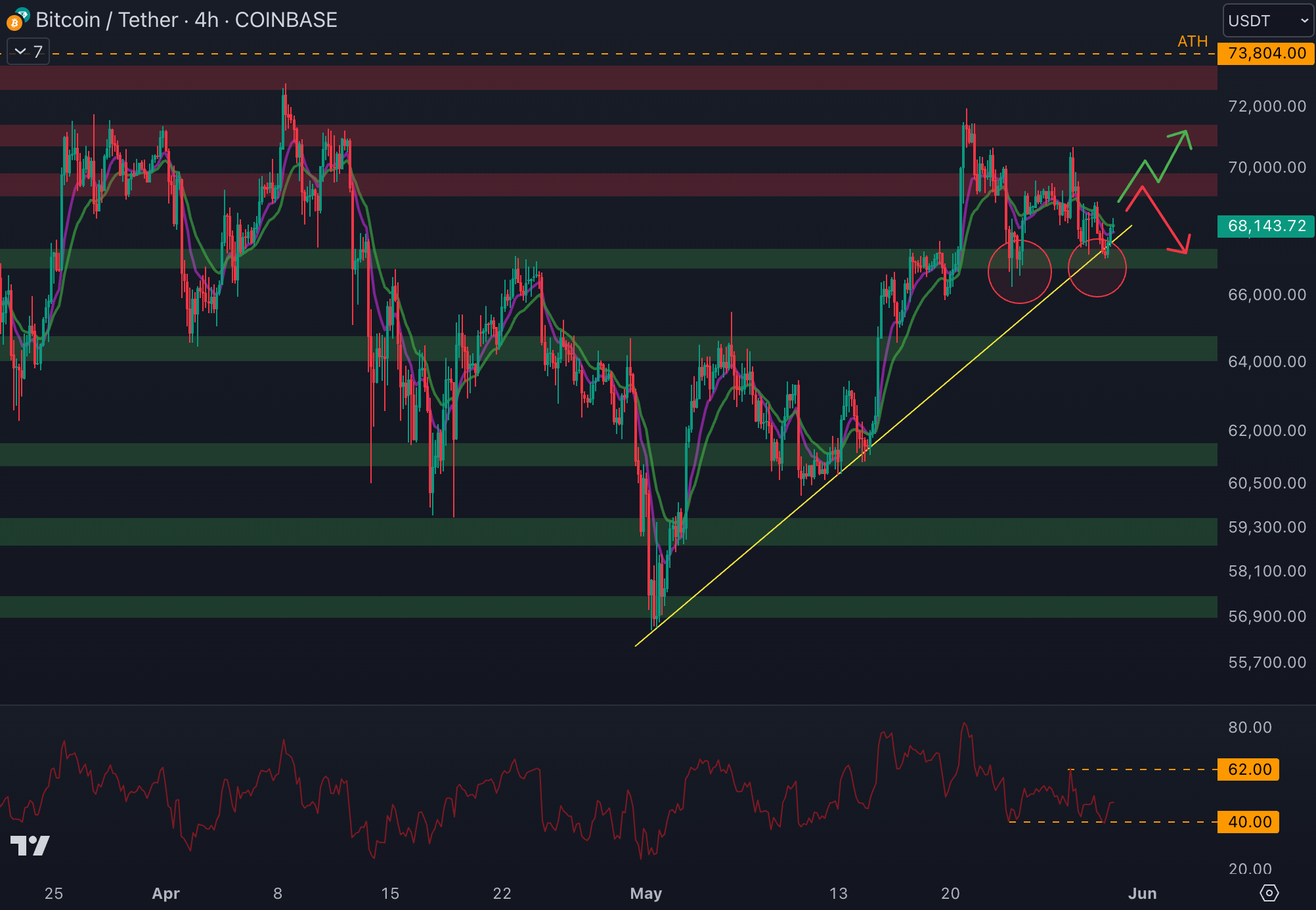 Une fois de plus, les acheteurs ont réussi à défendre le support à 67 000 $. Par conséquent, le cours reste au-delà de la trendline haussière :