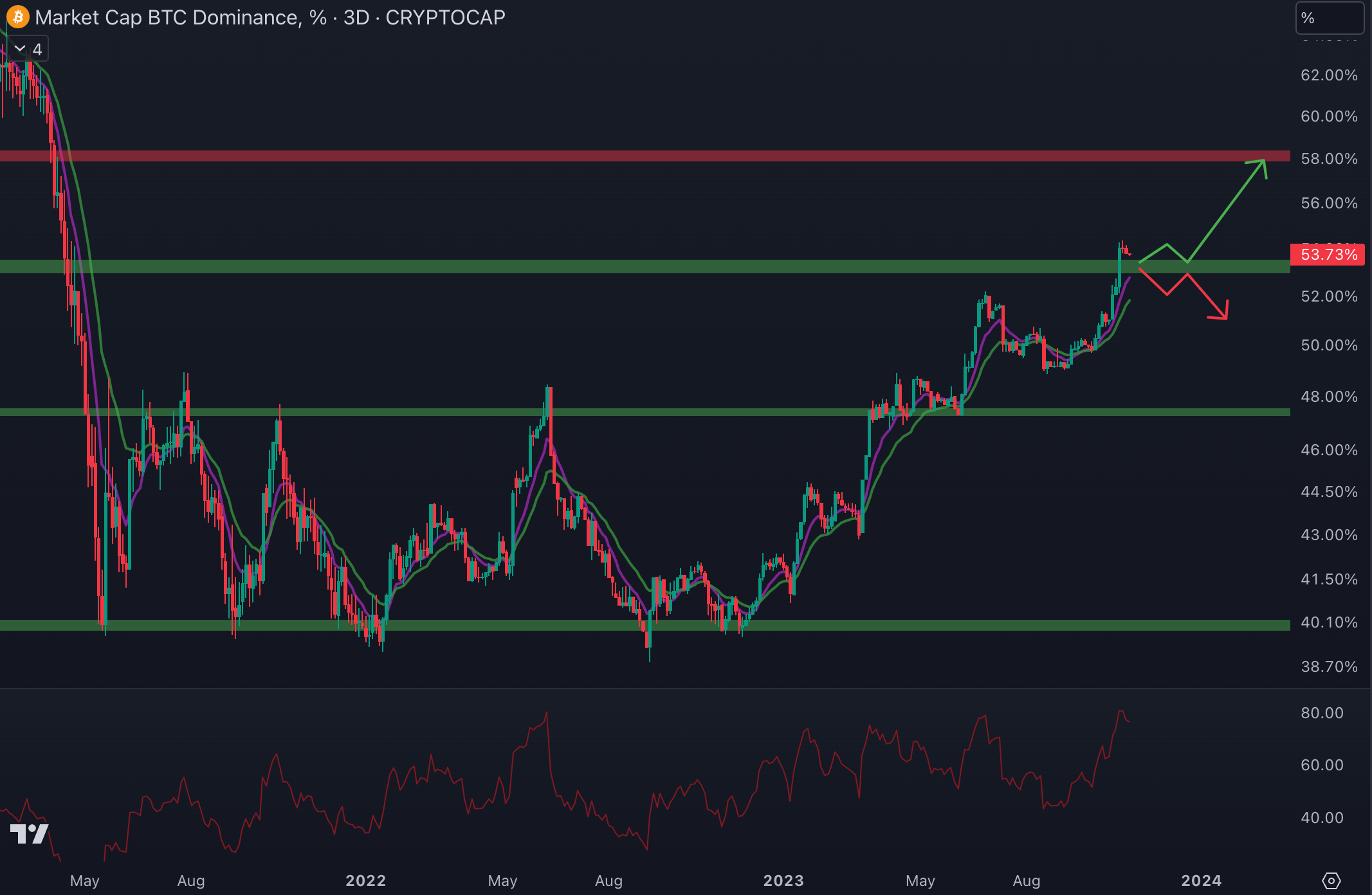 La tendance est claire depuis environ un an. En effet, le cours de la dominance du Bitcoin affiche une dynamique haussière depuis la fin de l’année 2022. Récemment, le cours de la dominance avait connu une légère correction. Toutefois, avec la clôture au-dessus du dernier plus haut (à 52 % de dominance), la tendance haussière se poursuit :