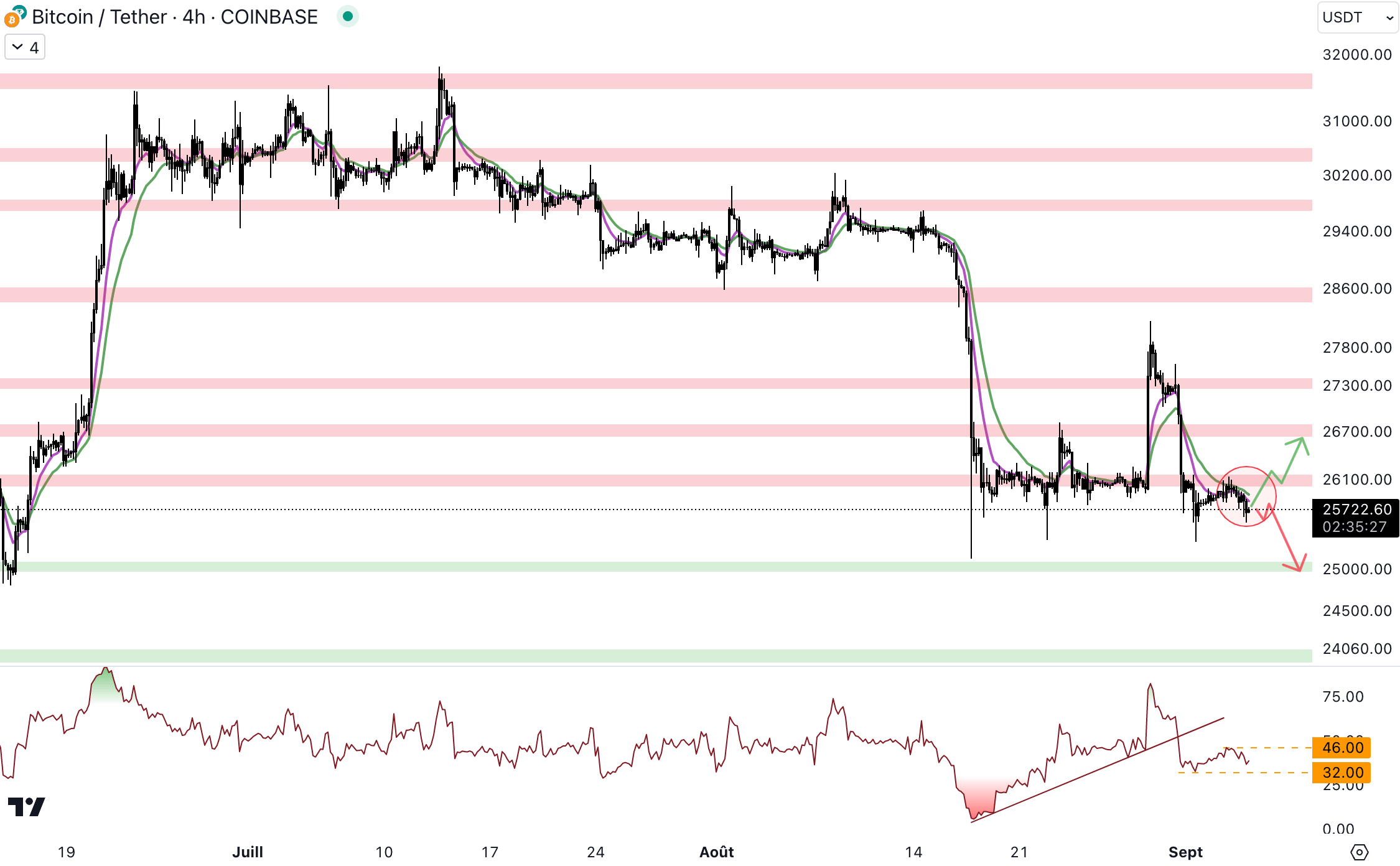 Le cours du Bitcoin bloque au niveau de la résistance à 26 000 $ en 4H