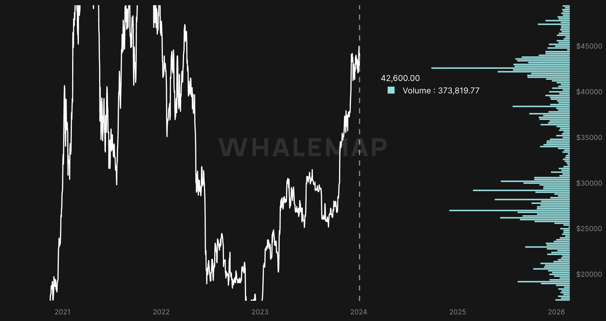 Le Volume profile proposé par le site Whalemap permet de savoir où ont été accumulé les BTC. De fait, une importante accumulation de BTC sur un niveau servira de support lors de chute, et de résistance en cas de hausse :