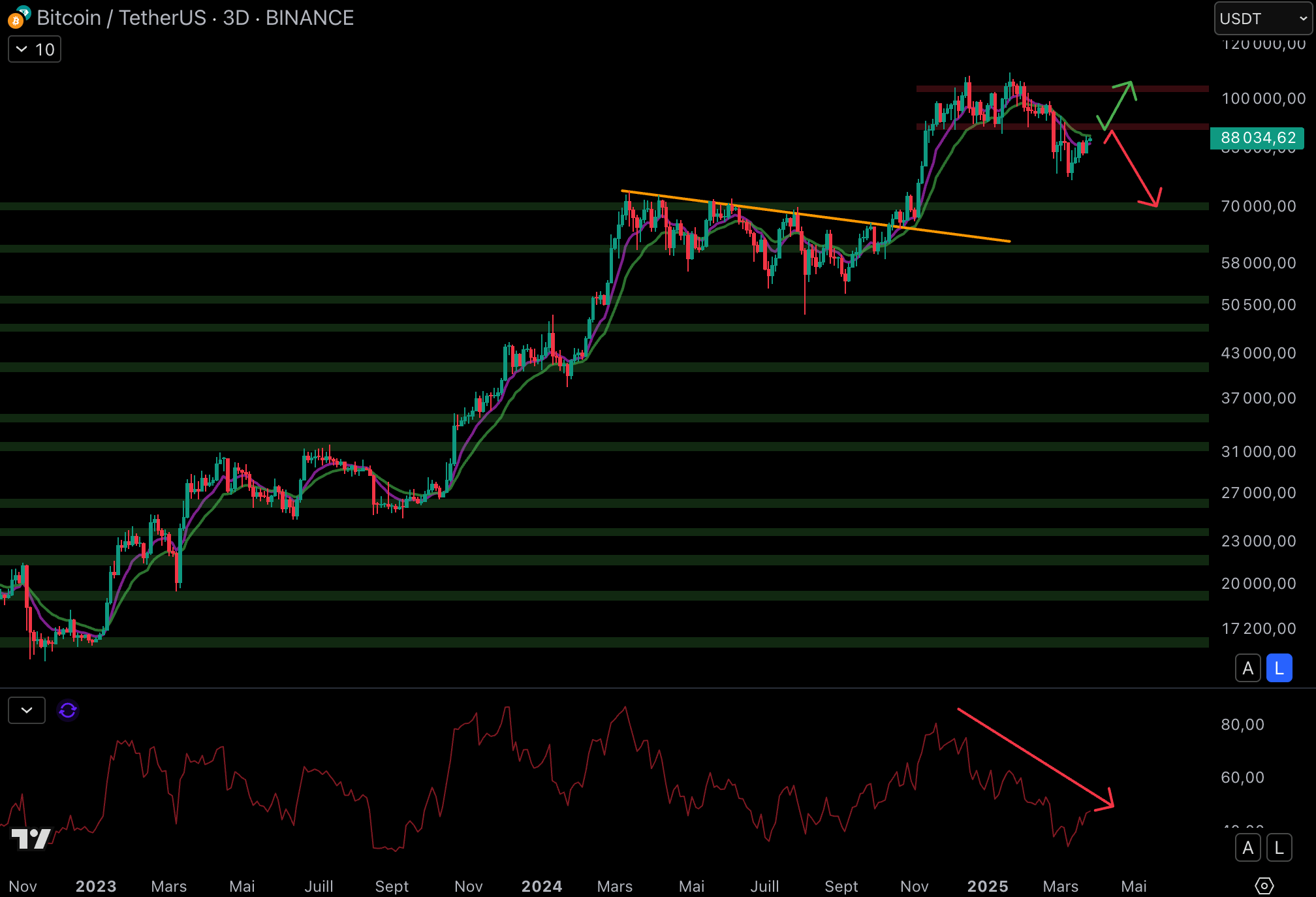 La paire est en train de rebondir, mais la dynamique reste globalement baissière depuis le top de 2022. Les probabilités sont donc toujours orientées vers une nouvelle vague de baisse sur la paire or/BTC, mais attention, car le RSI vient de valider une divergence haussière. Et une cassure de la trendline baissière sur le RSI pourrait engendrer de la volatilité haussière sur la paire.