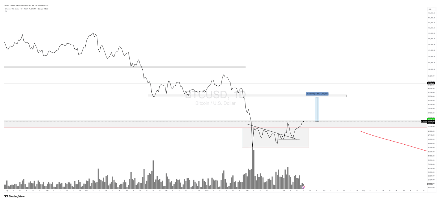 D’ailleurs, la récente hausse n’est pas une surprise pour la communauté Steady Lads. En effet, Cara partageait son optimisme sur le Bitcoin il y a quelques jours, juste avant le run au-delà des 74 000 $. Le breakout est là, il est beau, mais Cara surveille désormais si le mouvement a assez de souffle pour transformer cet essai en véritable tendance de fond. Si ce bottom est le vrai, c’est une opportunité comme on n’en voit que tous les deux ou trois ans.