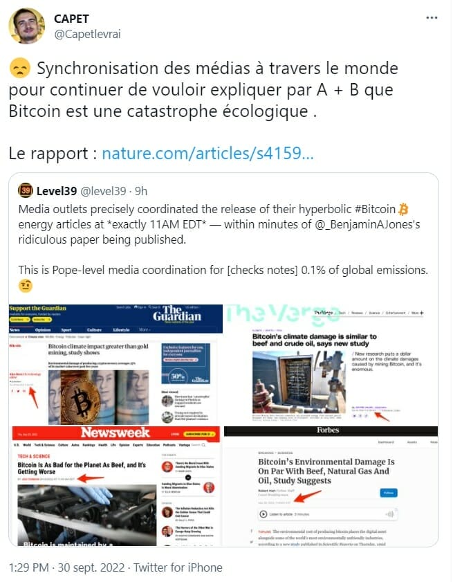 Nous passerons évidemment sur l’habituelle simplification du problème écologique global à un unique symptôme, la température, du à un seul facteur, le CO2. De même, impasse totale sur les externalités positives du réseau Bitcoin pour la société, nécessitant, comme tout outil, de l’énergie pour fonctionner.