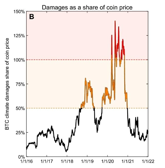 Le dernier graphique représente les « dommages climatiques » de Bitcoin comme pourcentage de son prix. Cette notion est intéressante. Comment quantifier en dollars les « dommages climatiques » ?
