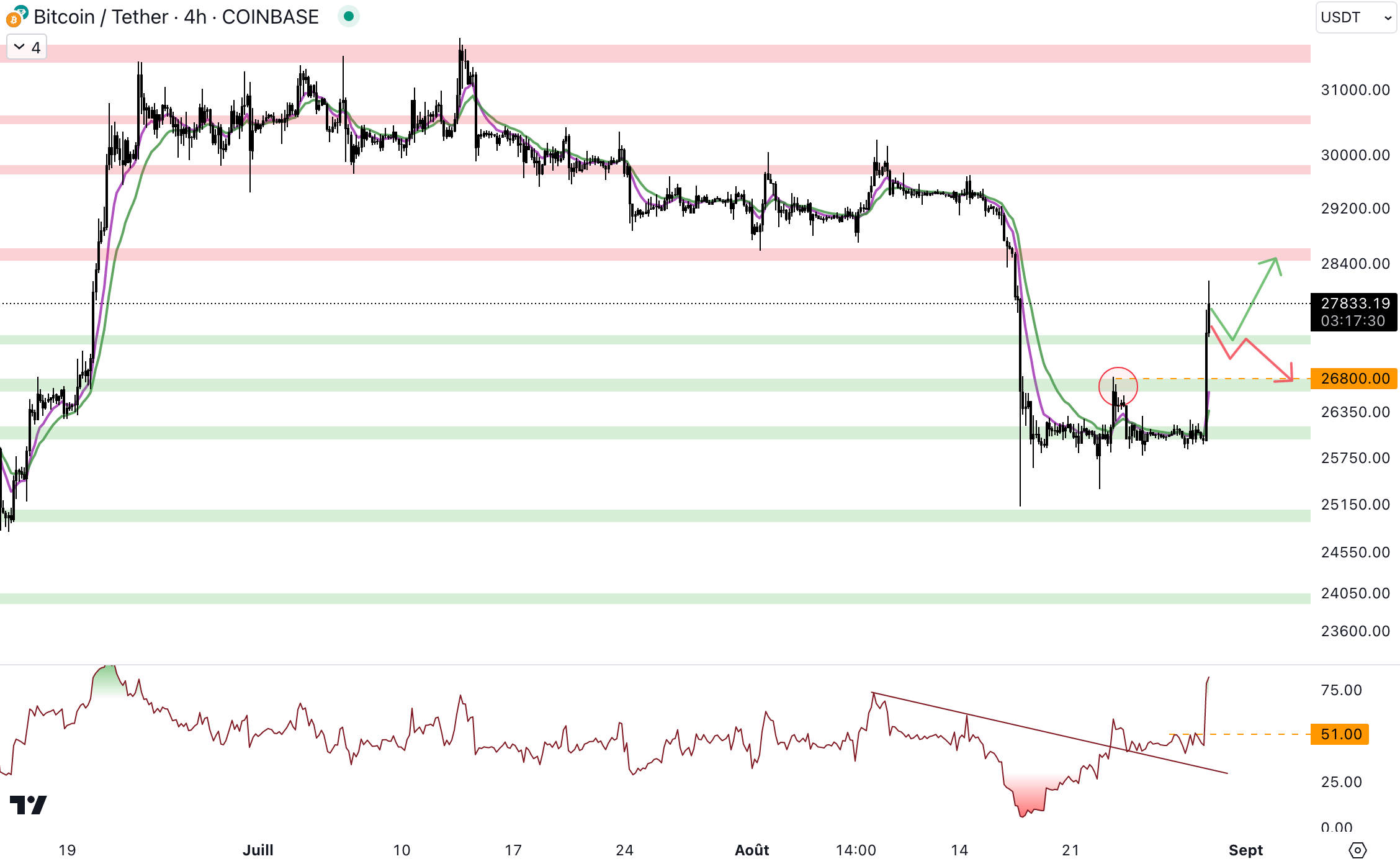 Le cours du Bitcoin explose à la hausse suite à la victoire de Grayscale face à la SEC. Le cours explose de plus de 8 % en l’espace de quelques heures seulement. Aussi, en quelques heures, le marché enregistre d’importantes liquidations. En effet, plus de 100 millions de liquidations (shorts) ont été enregistrées par le marché. Le cours du Bitcoin a touché les 28 000 $, il pourrait bloquer au niveau de la résistance en 4H à 28 500 $. Autre bonne nouvelle du jour : X (Twitter) pourrait mettre en place les paiements en cryptomonnaies.
