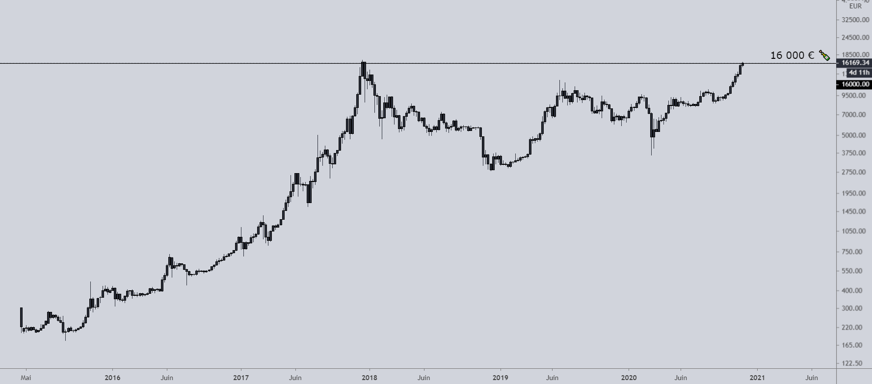 Avec un plus haut journalier à 16 295 euros à l’heure d’écrire ces lignes, Bitcoin est en train de tutoyer son all time high (ATH) de décembre 2017, qui avait frôlé les 17 000 euros.