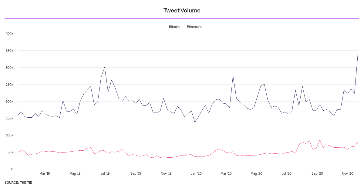 On voit ainsi, dans le premier graphique ci-dessous, que le volume de tweets concernant Bitcoin vient tout juste de commencer à augmenter ces derniers jours. Twitter a vu plus de 340 000 messages parler du roi des cryptos cette dernière semaine.