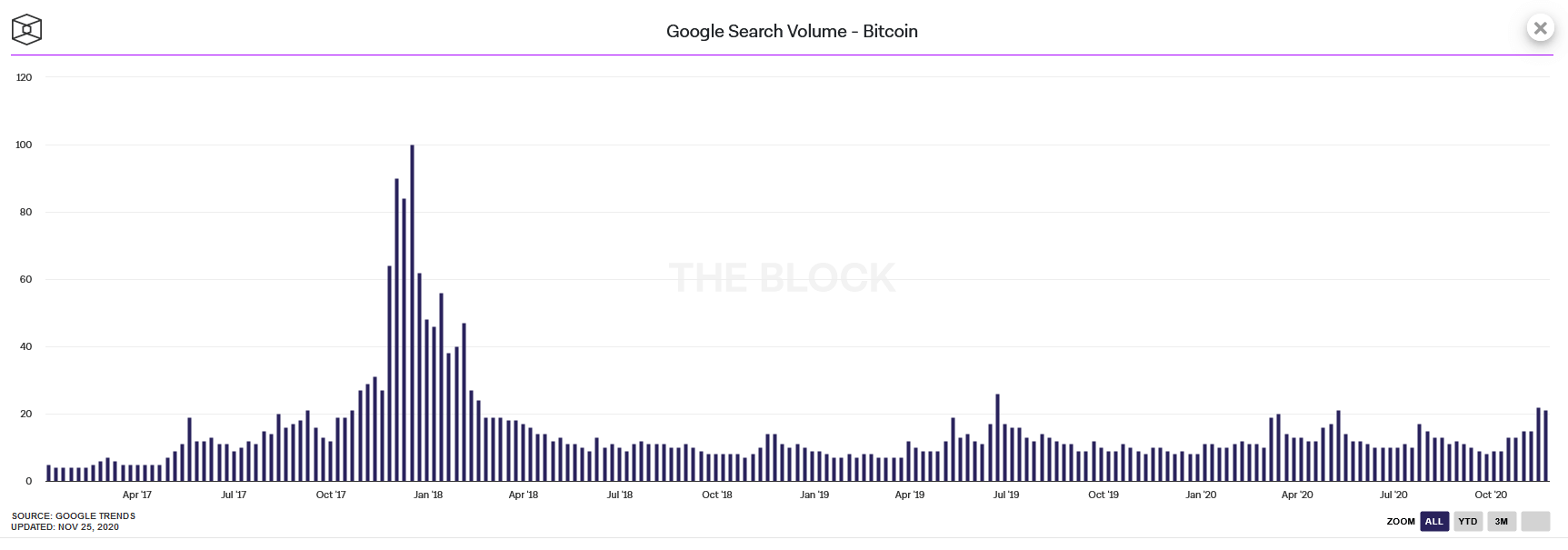 Si l’on considère que le précédent plus haut avait été atteint alors que tout le monde n’avait plus que Bitcoin aux lèvres, la situation actuelle peut être perçue de façon très optimiste. En effet, Bitcoin est déjà tout proche de son ATH, mais est encore loin de refaire la une des médias de masse et d’être le sujet de conversation du moment.