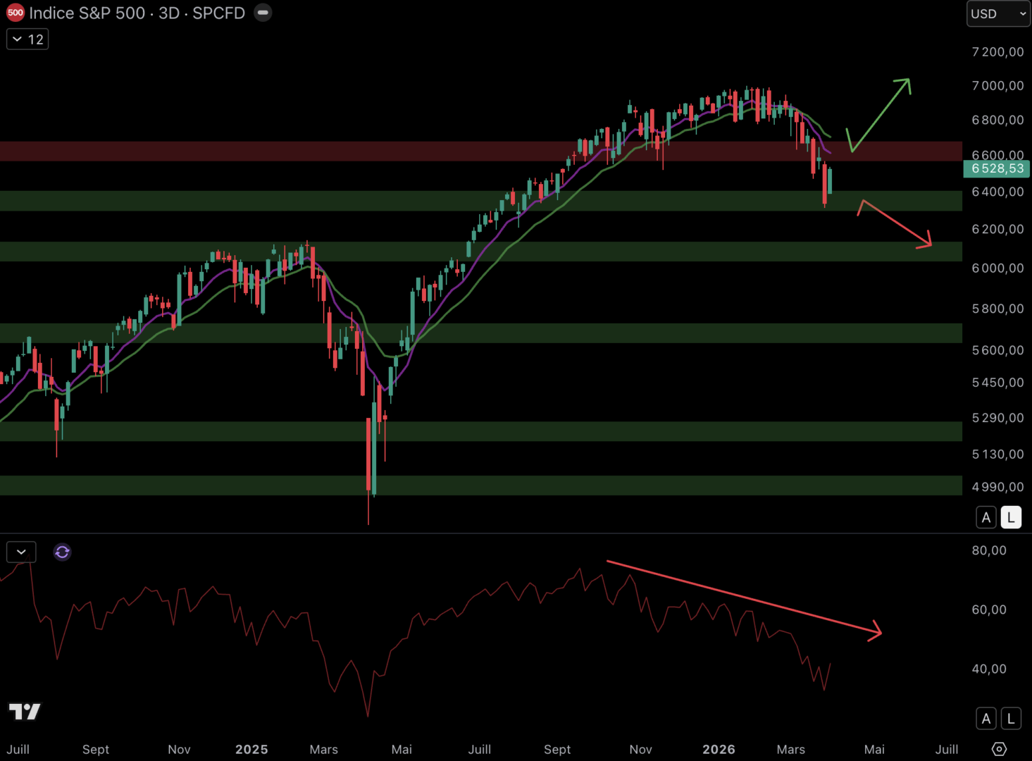 Cours du S&P 500 face au dollar (3D) – Inscrivez-vous à Trading View en utilisant notre lien d’affiliation.
