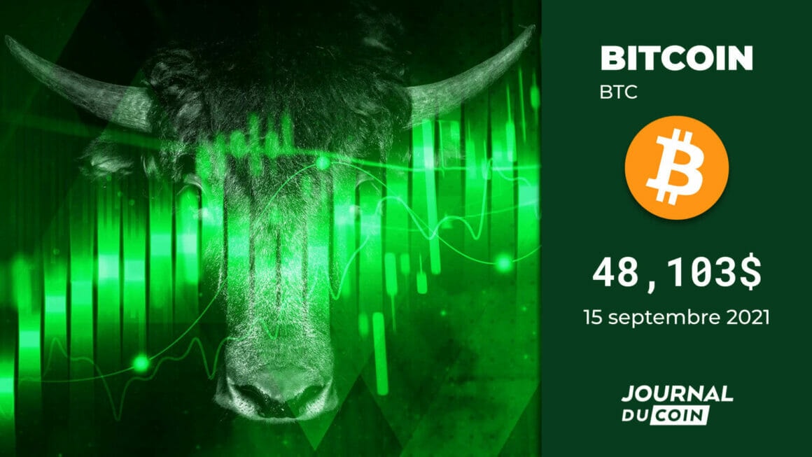 La journée est fortement haussière pour Bitcoin qui monte au-dessus des 48 400 $ sur Bitfinex aujourd’hui, 15 septembre 2021. Bitcoin se négocie à 48 103 $ au moment de la rédaction de cet article, et enregistre actuellement une hausse quotidienne de 3,49 %.
