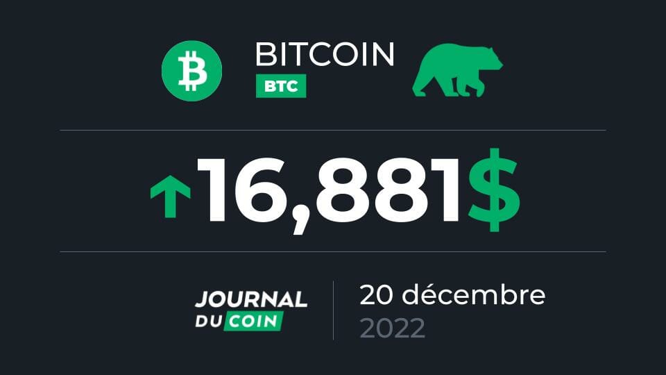 Le prix du Bitcoin monte jusqu’aux 17 057 $ sur Bitfinex aujourd’hui, 20 décembre 2022. La cryptomonnaie se négocie aux 16 881 $ au moment de la rédaction de cet article. Son cours enregistre actuellement un gain quotidien de 2,63 %.