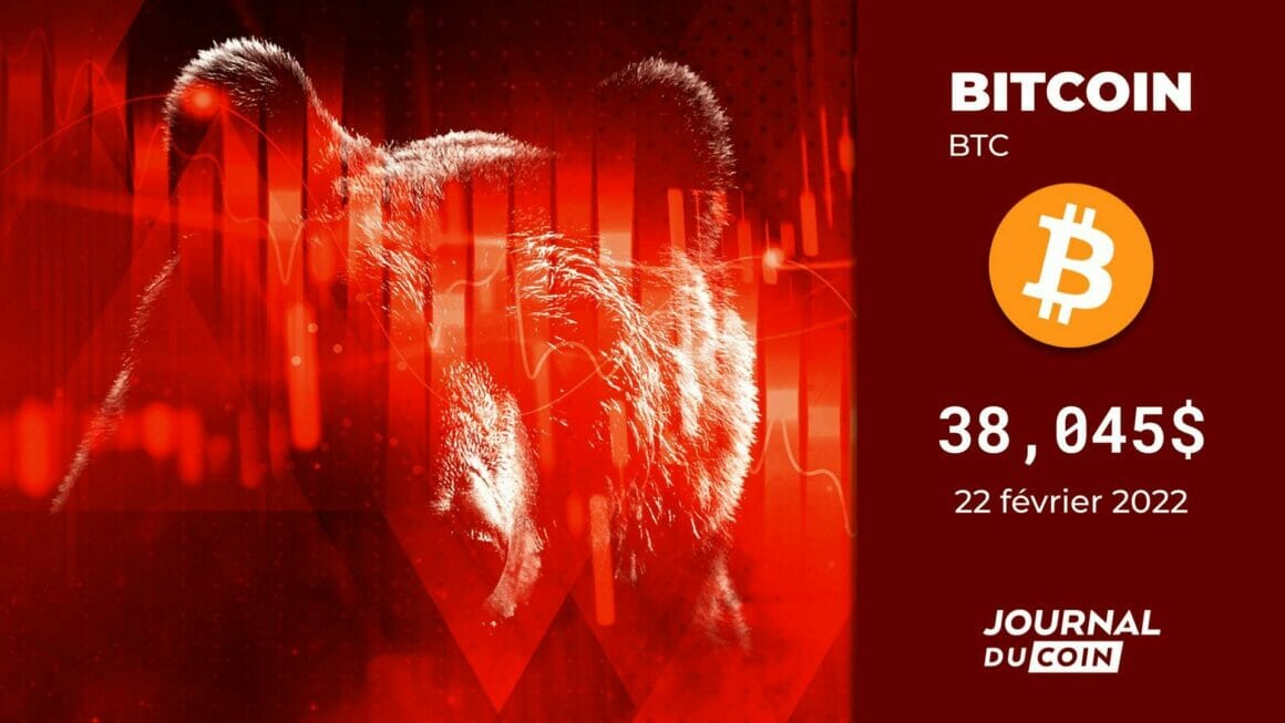 Le prix du bitcoin chute jusqu’aux environs des 36 400 $ sur Bitfinex aujourd’hui, 22 février 2022. Le rebond a permis à bitcoin de reprendre les 37 000 $ puis les 38 000 $. Son prix s’élève à 38 045 $ au moment de la rédaction de cet article, et enregistre actuellement un gain quotidien de 2,66 %.
