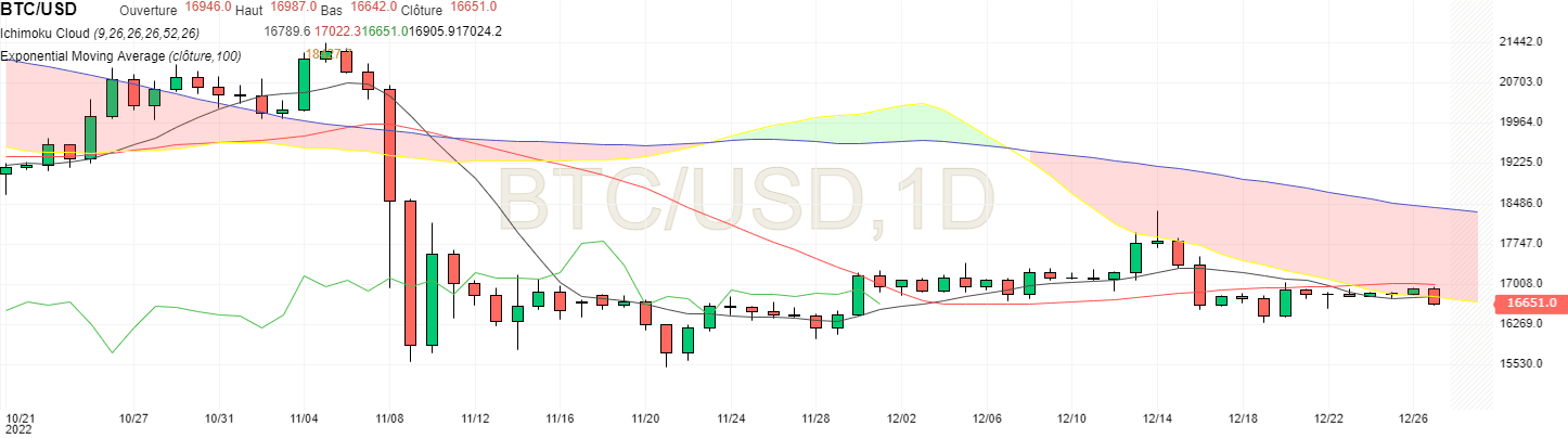 Sur une base quotidienne, le prix du Bitcoin se heurte à la résistance formée par le nuage d’Ichimoku, qui est descendu sous les 17 000 $ depuis quelques jours.