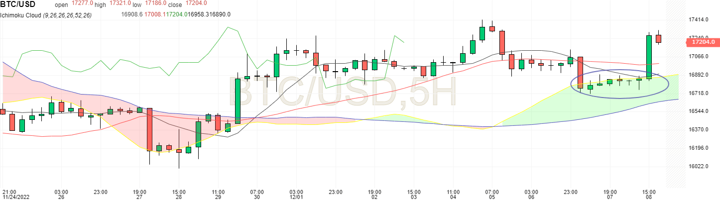 Comment les taureaux sont-ils parvenus à reprendre la main pour éviter d’autres baisses à la suite d’une perte d’un support journalier essentiel ? Une vue rapide du prix du Bitcoin sur 5h par rapport aux courbes d’Ichimoku montre que sur cette période, la cryptomonnaie a bénéficié du soutien du nuage pour son rebond haussier.