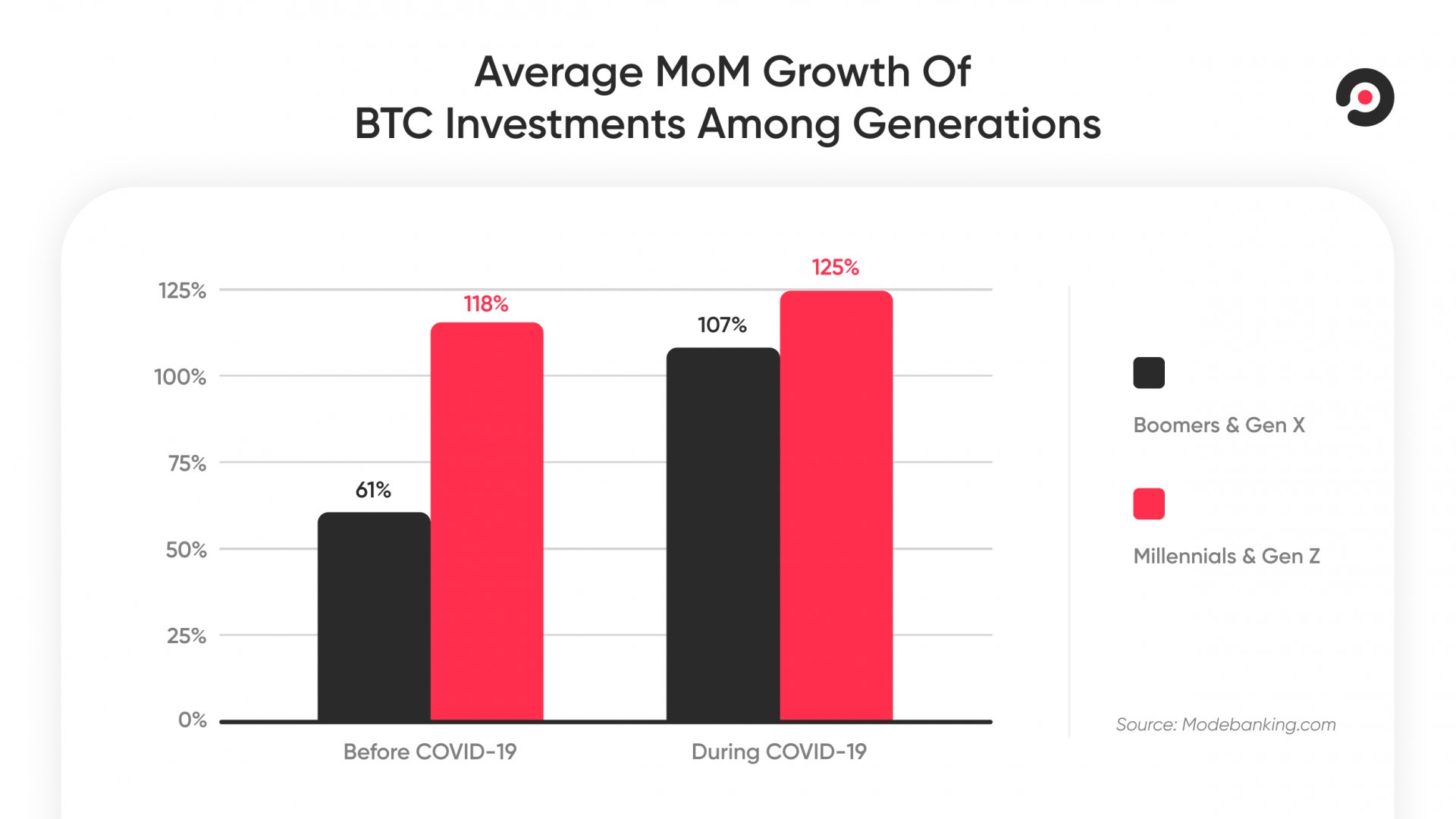 Malgré la domination des millenials et de la Gen Z dans la croissance des achats liés à Bitcoin, l’écart devient de plus en plus infime entre les générations. Avant la pandémie, la croissance constatée chez les baby boomers et la génération X était de 61%. Durant le confinement, elle a explosée pour atteindre les 107%.