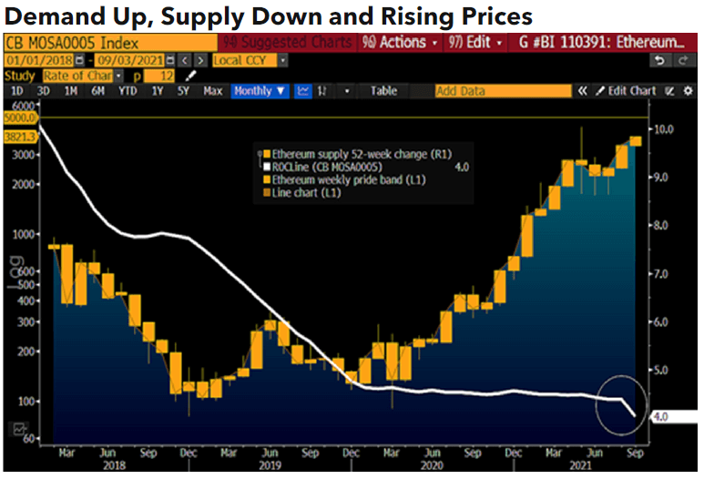 En outre, avec le lancement de la version 2 d’Ethereum, l’offre d’ETH disponibles ne cesse de diminuer. Étant donné que la demande d’ethers augmente, cela permet au prix du jeton de conquérir de nouveau sommet. Pour la première fois, le nombre d’ETH nouvellement créés au cours des 12 derniers mois représente moins de 4 % de l’offre totale.