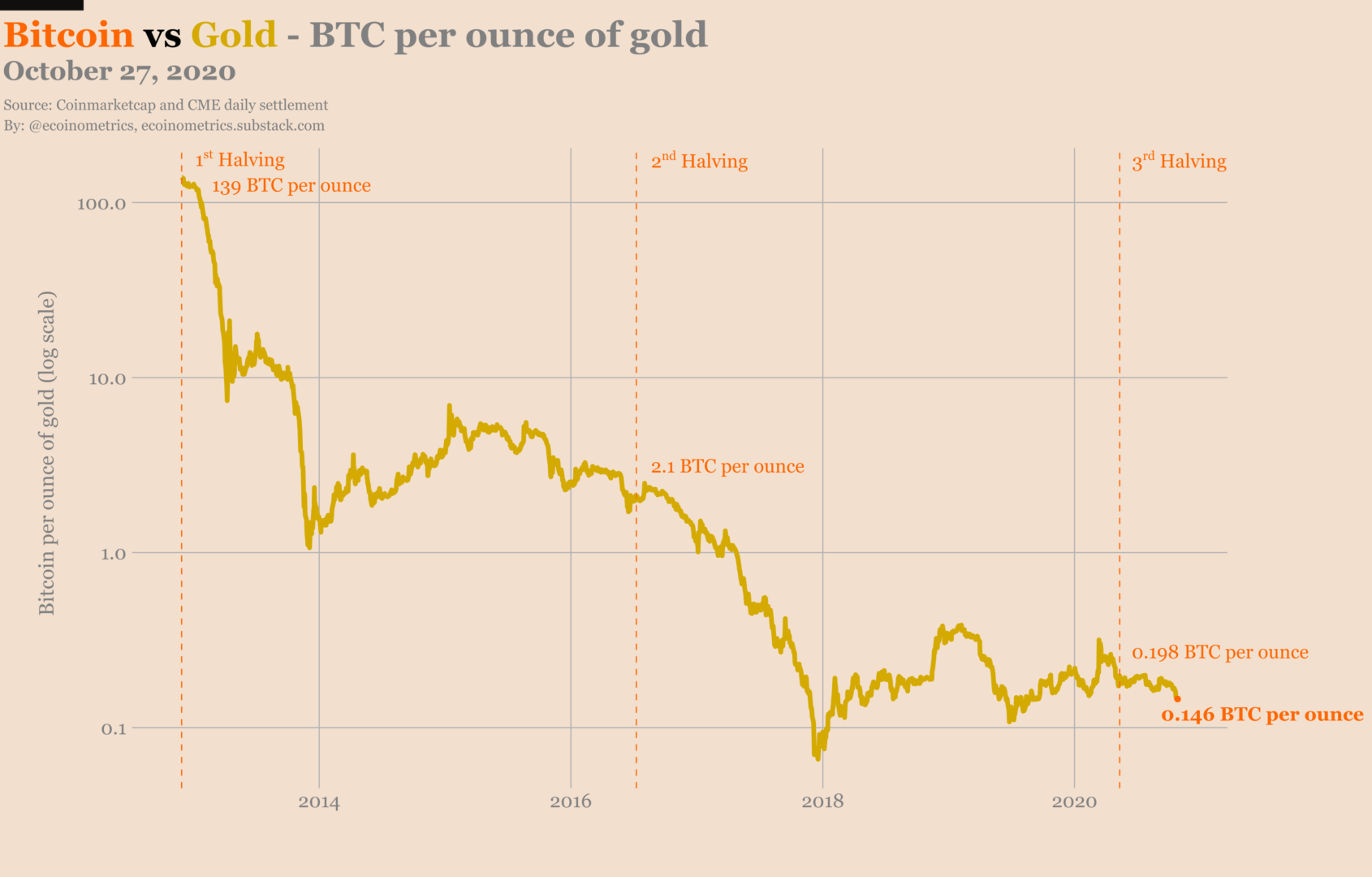 Un échange s’effectuait à 139 BTC par once à cette époque et est tombé à seulement 0,146 BTC/once actuellement, soit un prix presque divisé par 1 000 contre le BTC, et ce, pendant que le cours de l’once d’or n’a augmenté que de 27 %.