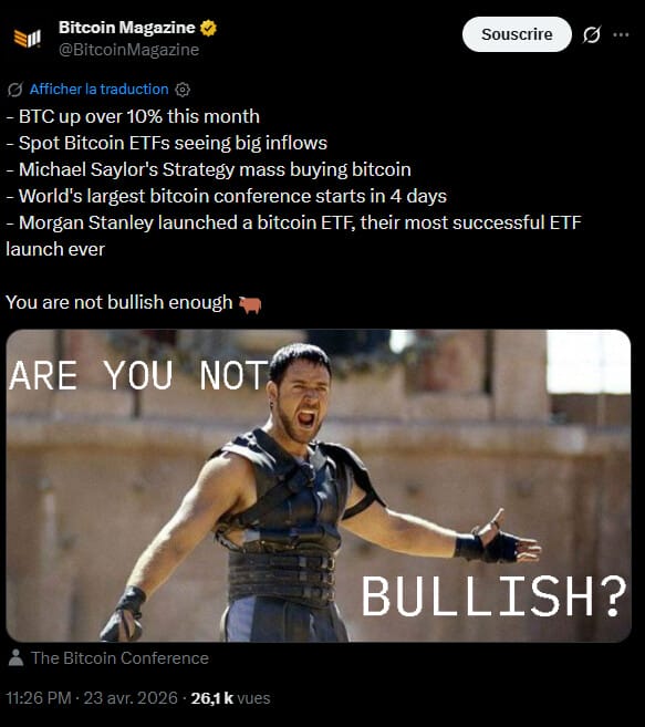Jusqu’ici tout va bien… Le marché du Bitcoin affiche une dynamique contrastée en ce mois d’avril. Alors que les fonds négociés en bourse (ETF) au comptant aux États-Unis enregistrent une série d’entrées de capitaux ininterrompue, les données issues de la blockchain révèlent un comportement de vente soutenu chez les détenteurs à court terme. Cette dualité entre l’accumulation institutionnelle et la distribution des investisseurs récents place le cours de l’actif dans une zone de prix déterminante pour la suite de la tendance annuelle. Détails à suivre.