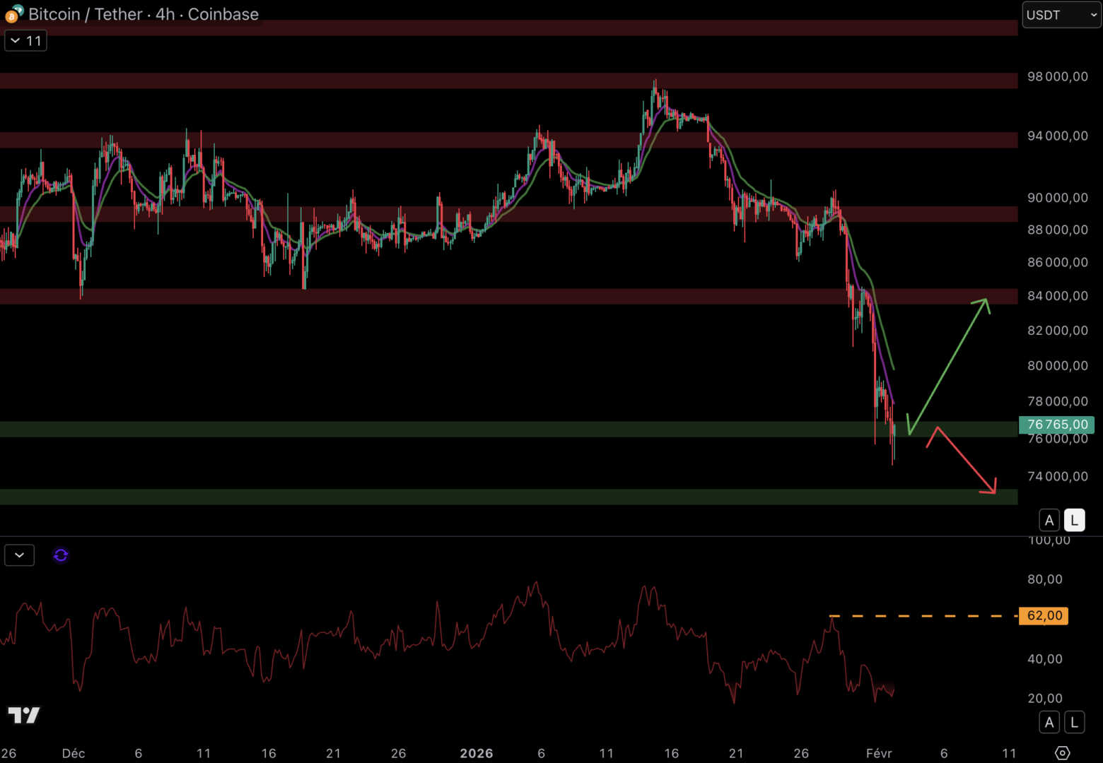 Depuis le top à 98 000 $, le cours du Bitcoin a dégringolé de près de 25 %. En 4H, le cours est situé sous les moyennes mobiles (EMA 9/EMA 18) baissières, et il est de retour sur le support à 76 500 $ :