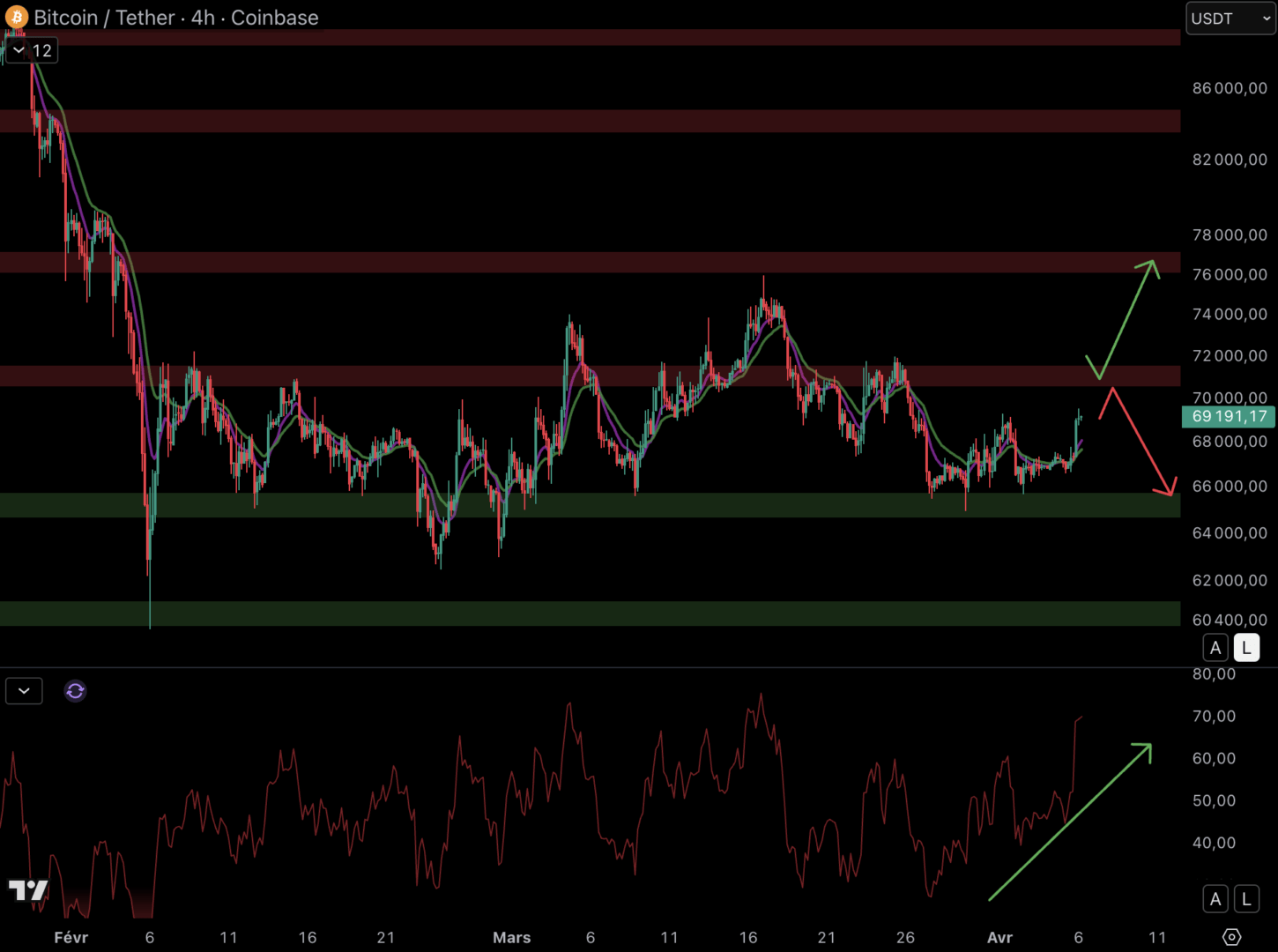 BTC frôle les 70 000 $, mais le risque de baisse est présent ! Bitcoin 6 avril