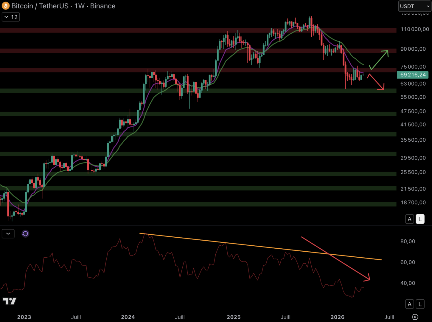 Le BTC a rebondi autour des 70 000 $, mais la tendance reste baissière en hebdomadaire. De plus, le cours se retrouve proche d’une zone dure à passer avec la résistance à 73 000 $ et les moyennes mobiles (EMA 9/EMA 18) baissières :