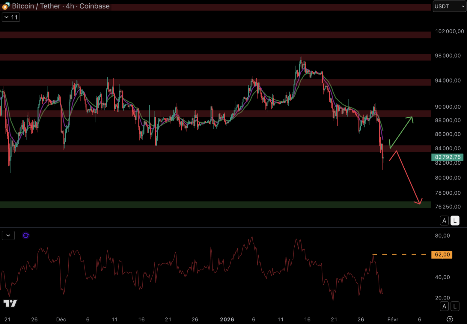 Le BTC est contrôlé par les vendeurs depuis le top marqué autour des 98 000 $. Le cours a chuté de 17 % environ, et le support à 84 000 $ n’a pas tenu :