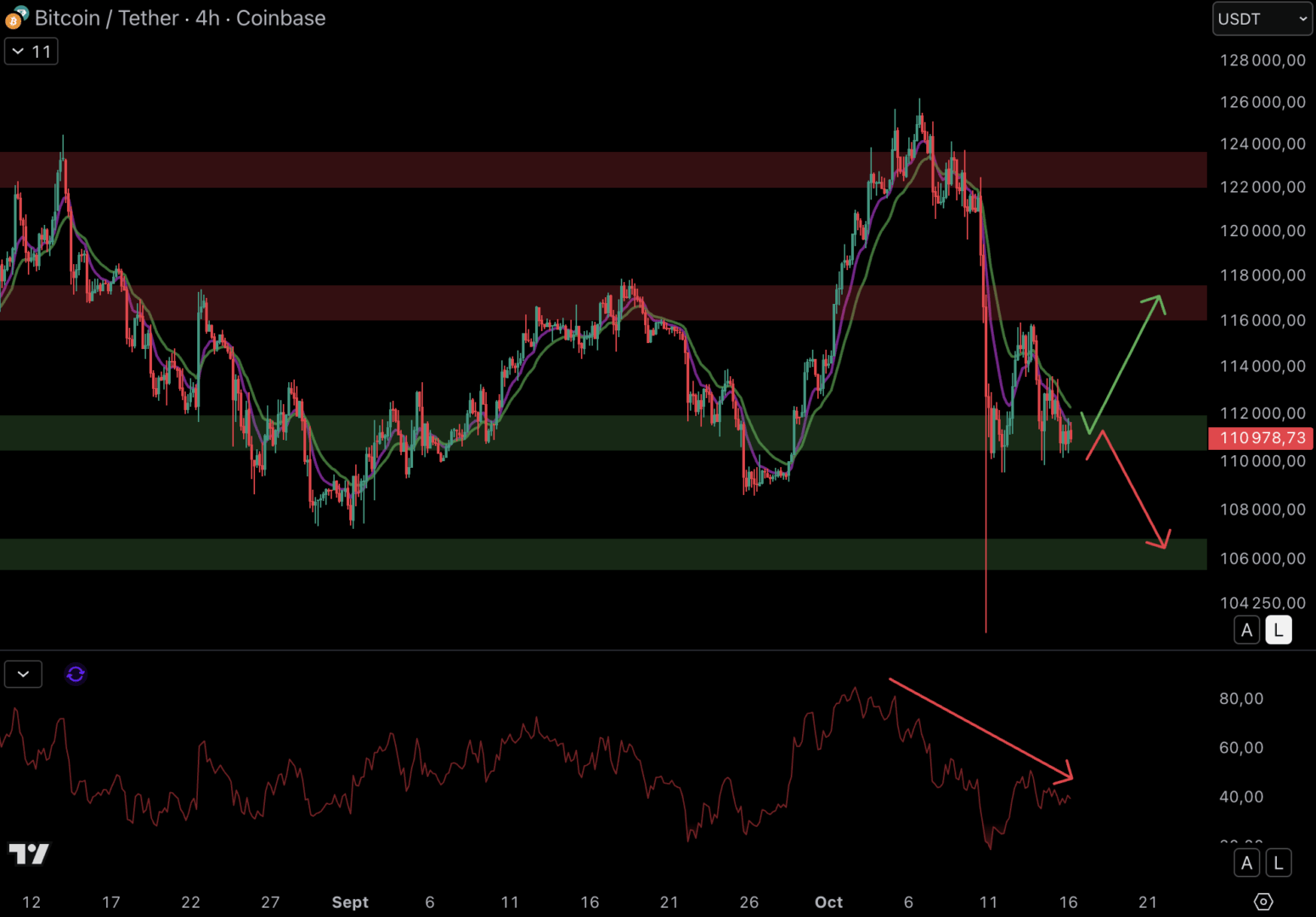 Depuis plusieurs jours, le cours du Bitcoin est bloqué entre le support 4H à 111 000 $ et les moyennes mobiles (EMA 9/EMA 18) baissières. Les acheteurs vont devoir se montrer pour ne pas connaître une nouvelle chute en direction du support à 106 000 $ :