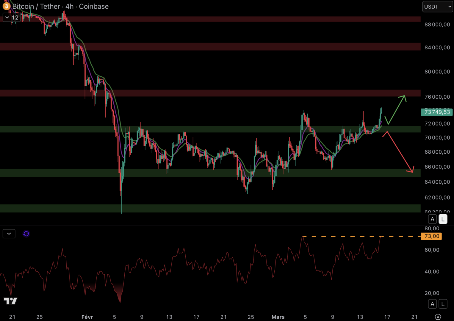Le cours du Bitcoin est sur la résistance à 73 000 $ - 16 mars 2026.