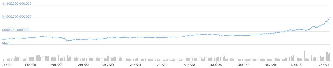 En effet, la capitalisation globale des cryptomonnaies a dépassé pour la première fois la barre du billion de dollars (1 000 milliards de dollars).