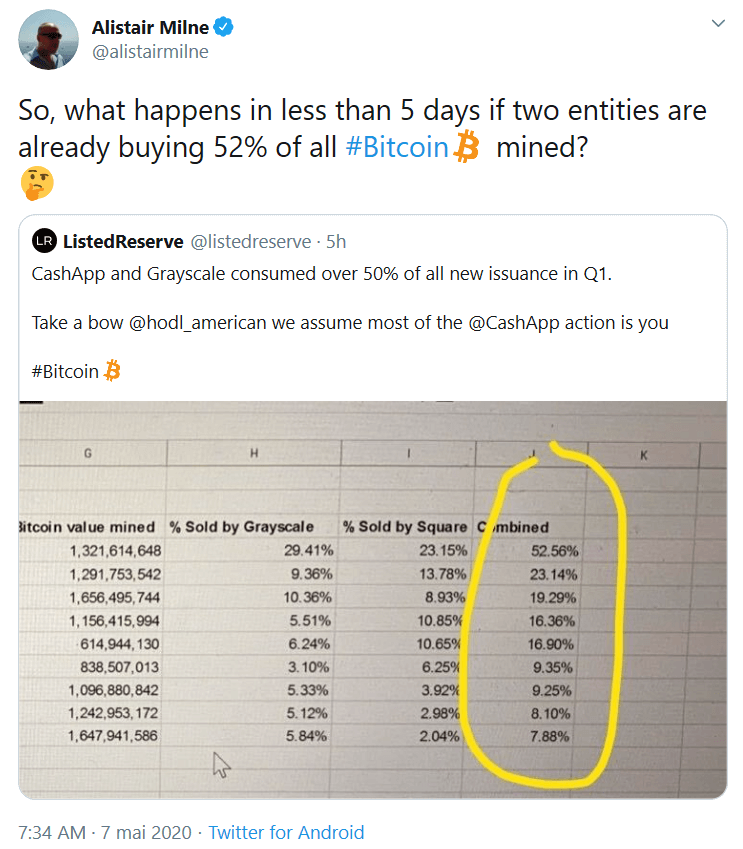 Autre élément, qui est signalé par le trader-investisseur Alistair Milne : si ces deux entités vendent déjà l’équivalent de 52% des bitcoins minés, que va-t-il se passer dans 4 jours, quand deux fois moins de bitcoins seront émis après le halving ?