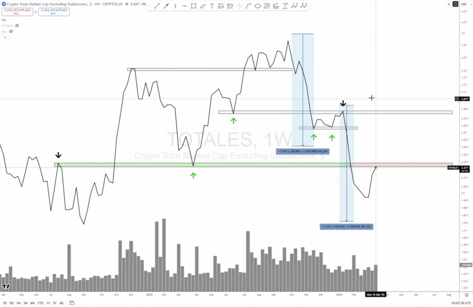 C’est le moment où il faut garder la tête froide. Le TOTALES (le marché global sans les stablecoins) vient de buter sur la zone des 2.25T. Si vous ressentez ce petit pic de « FOMO » (la peur de rater le train), Cara a un message pour vous : calmez-vous. Techniquement, nous ne sommes pas sur une zone d’achat, mais sur un niveau de résistance majeur :