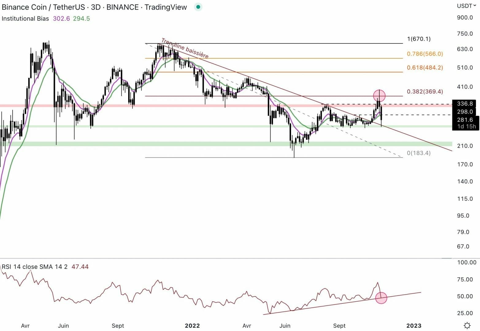 Le Binance Coin est dans un range entre 210 $ et 330 $. Récemment, le BNB a bloqué au niveau du premier arrêt (0,382 de retracement de Fibonacci). Le premier arrêt fait souvent office de résistance en période de marché baissier, ce niveau à 370 $ a rejeté le cours. De retour dans le range, le BNB a rebondi au niveau du support intermédiaire et au niveau de la trendline baissière à 260 $. Si le support intermédiaire cède, le cours pourrait chuter vers le bas du range à 210 $ voire, chuter en dessous du support.