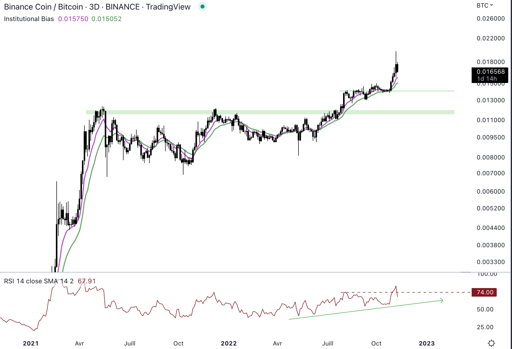Le BNB continue d’enchaîner les plus hauts face au roi des cryptomonnaies. La tendance est clairement haussière face au Bitcoin, tous les retracements au niveau du biais institutionnel (EMA 9/ EMA 18) amène des rebonds sur cette paire. Le momentum est également haussier, les acheteurs ont le contrôle de cette paire. Récemment, le RSI a fait un nouveau plus haut en dépassant 74.